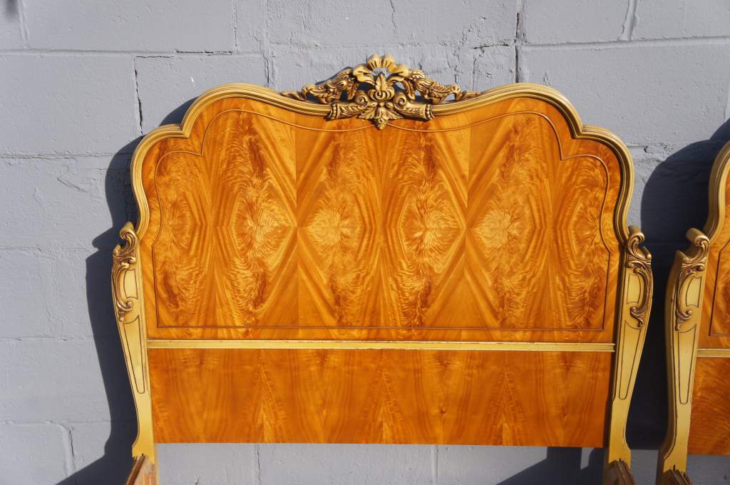 A stunning set of French Provincial Twin beds. Made by Fridman Furniture Company out of Cincinnati, Ohio. Birdseye maple with carved accents. Will be hand delivered via White Glover Service.