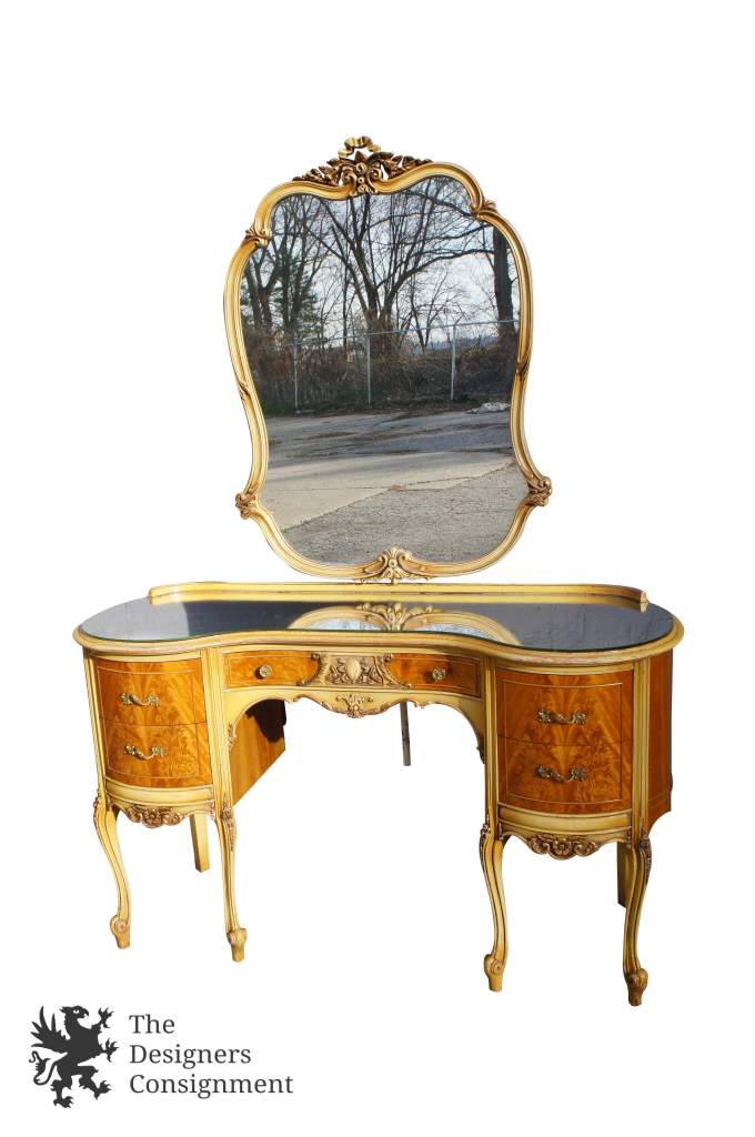 A stunning vanity/ makeup table by Fridman Furniture Company out of CincinnatiOhio. Made from Maple with beautifully carved accents. The mirror which is matching has a bar fitment that allows it to sit on top of the piece without being mounted to the wall. This could be removed if you would rather have it hanging on the wall. The vanity comes with a custom fitted mirrored glass top.