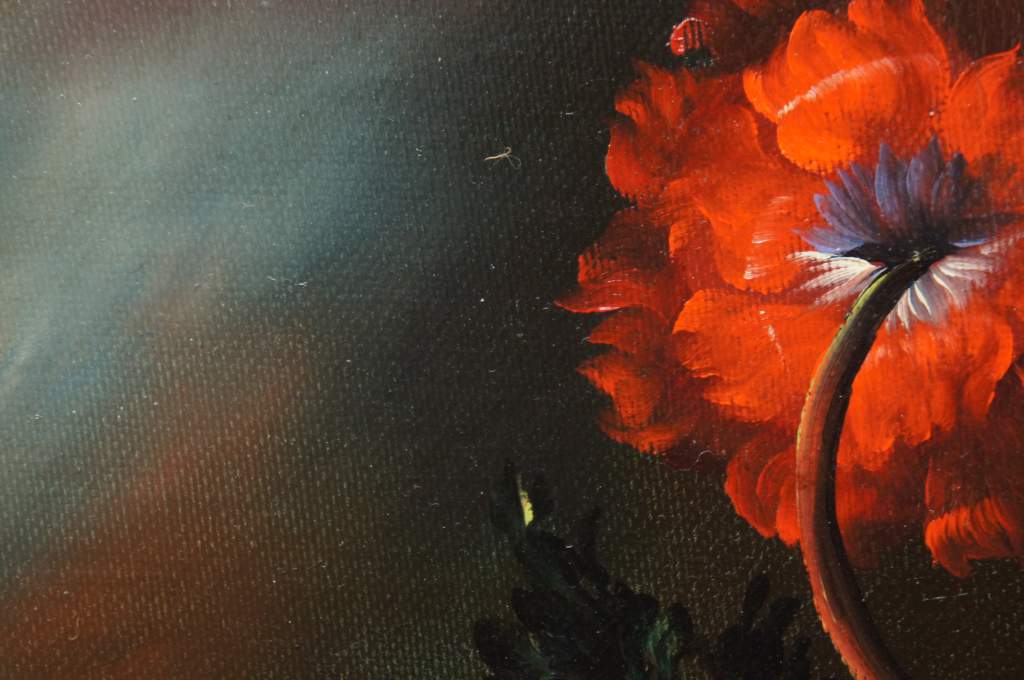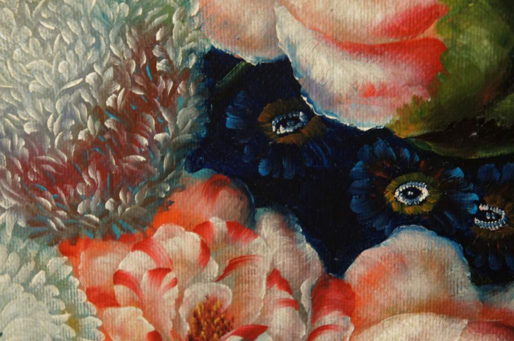 An original still life oil painting by artist Kantavil (b. 1900). This 20th century artist painted a realistic still life floral arrangement including orange poppies and pink peonies. Painted on canvas, this painting is signed “Kantavil” on lower right in red.