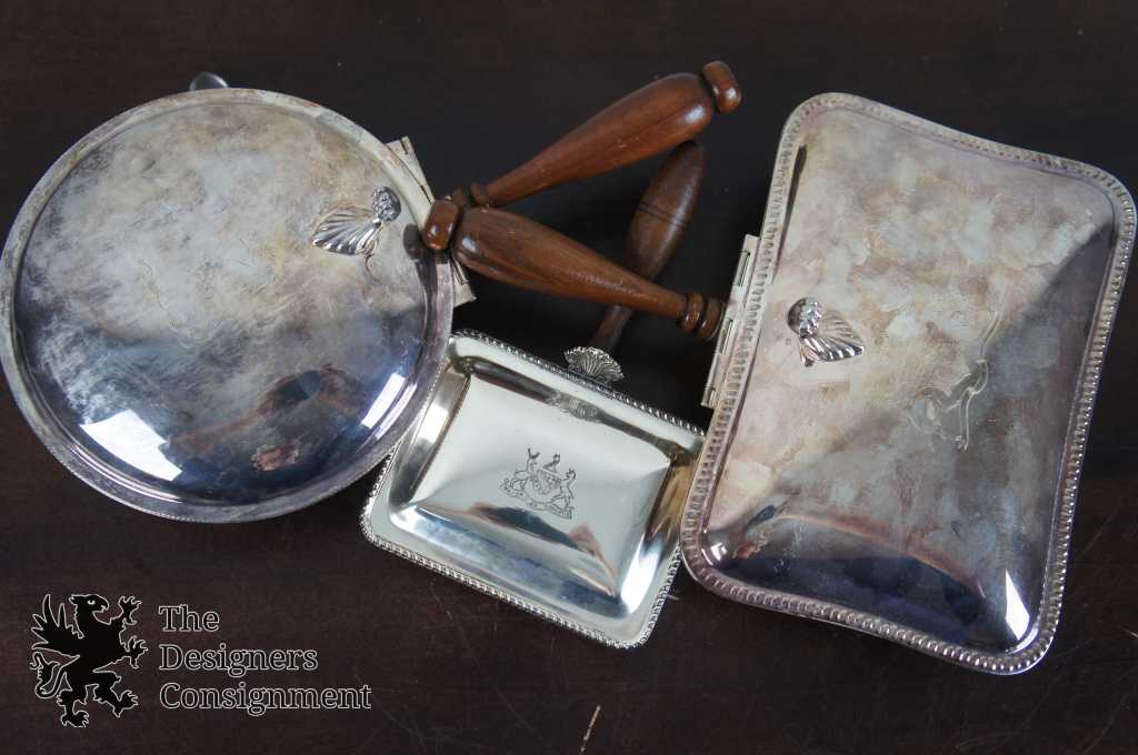 3 Vintage Sheffield + Rogers Silverplate Lidded Crumb Catcher Butter Pan Handled