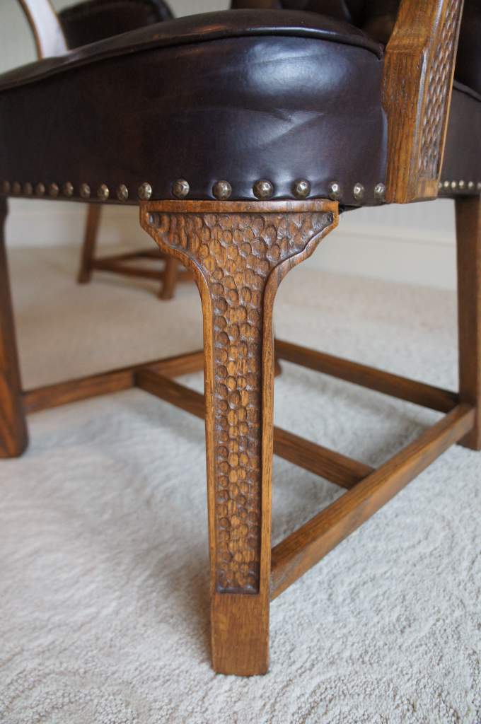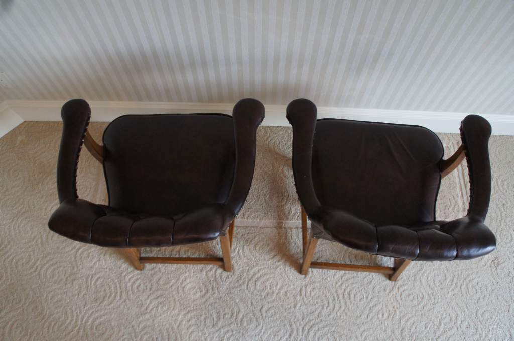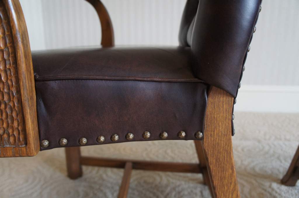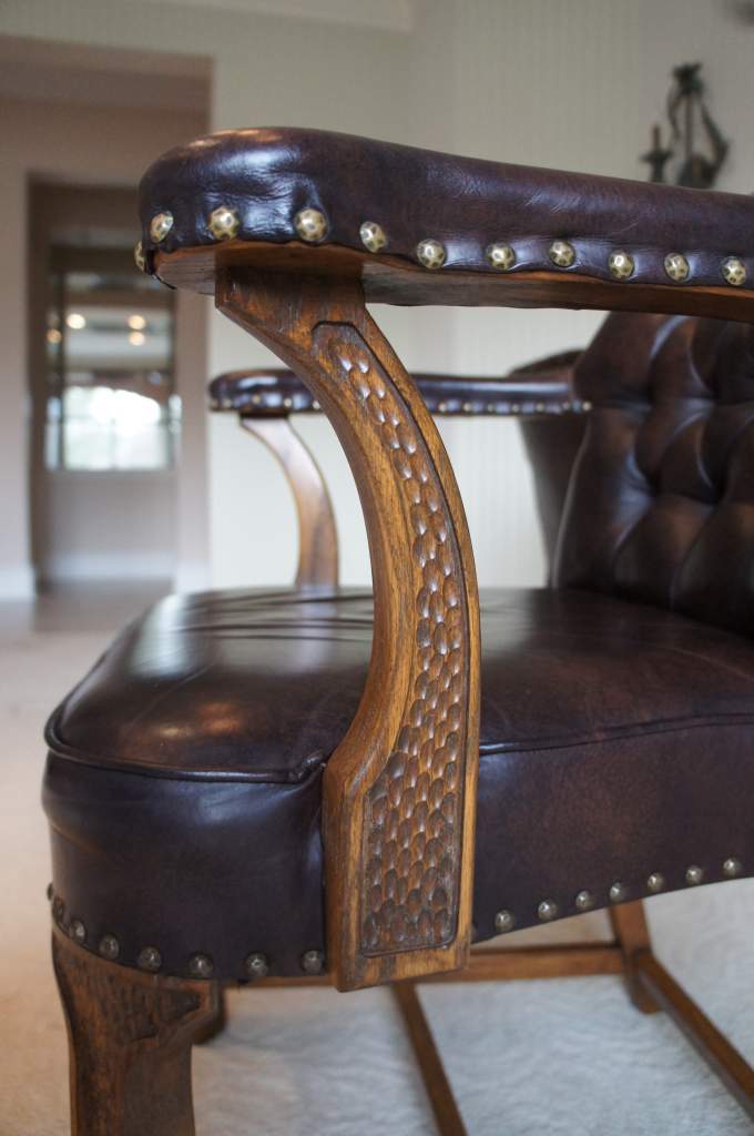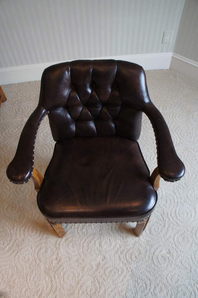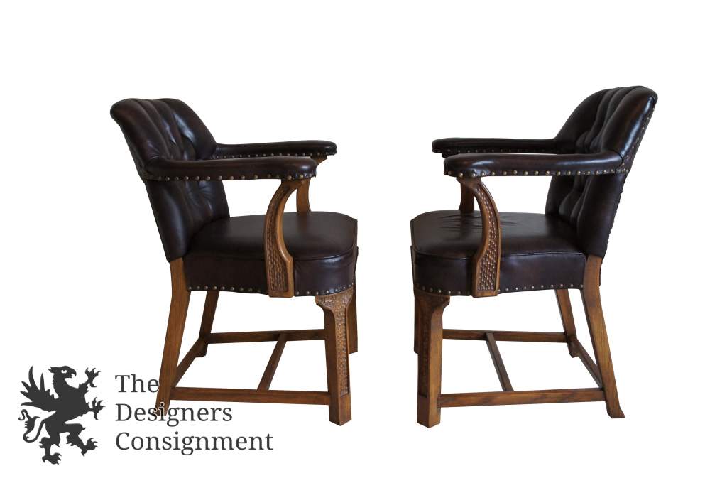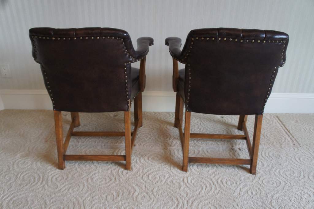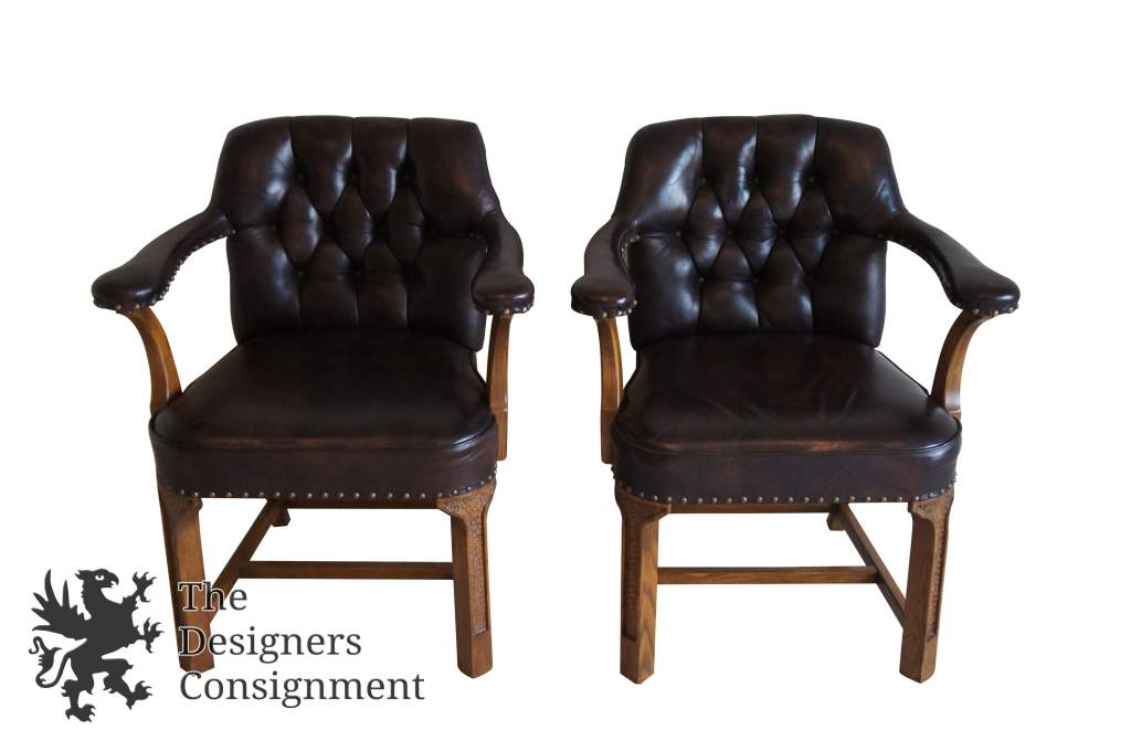 A great pair of brown leather tufted arm chairs for any office or setting. Part of Romweber's Viking Oak Collection. Will be Hand Delivered via White Glove Service