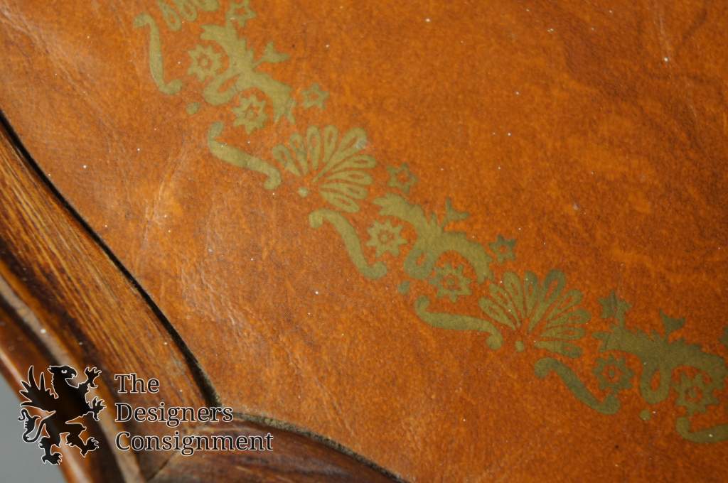 A neat Sheraton style Mahogany Accent Table. Features a leather top with gold accents.