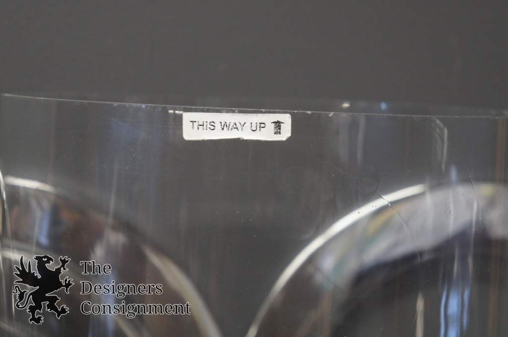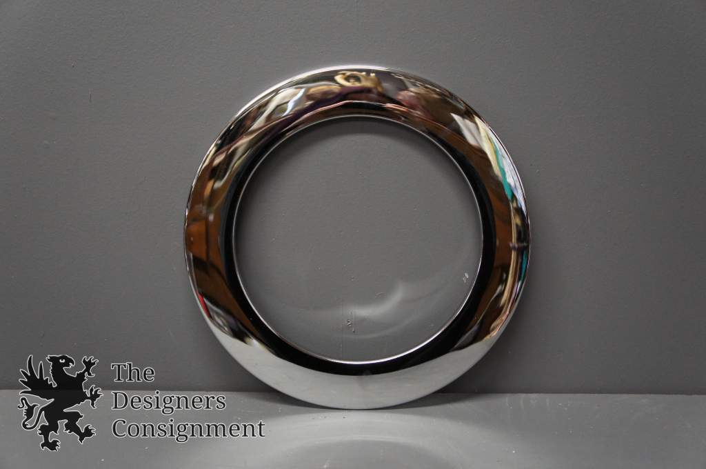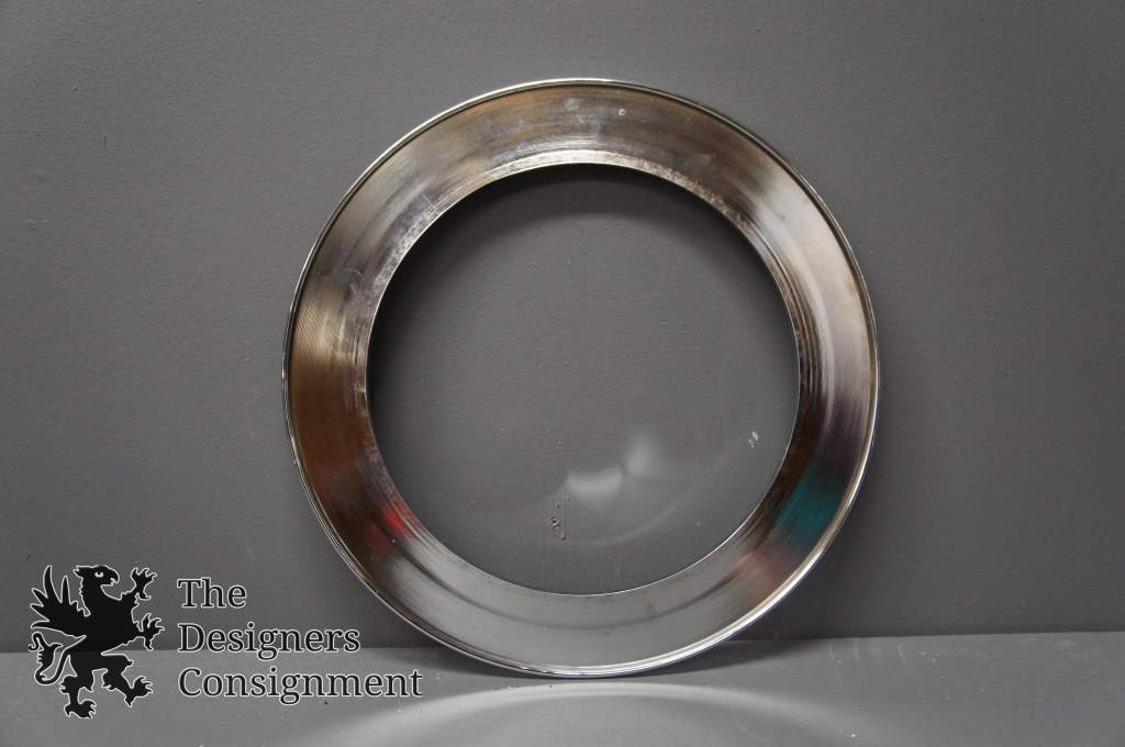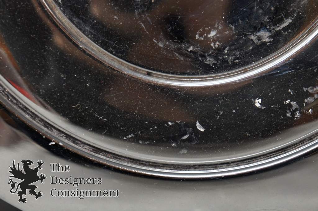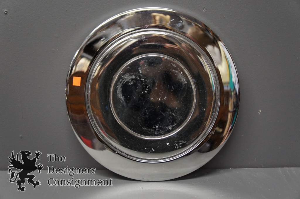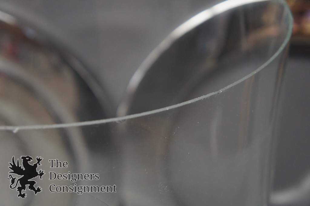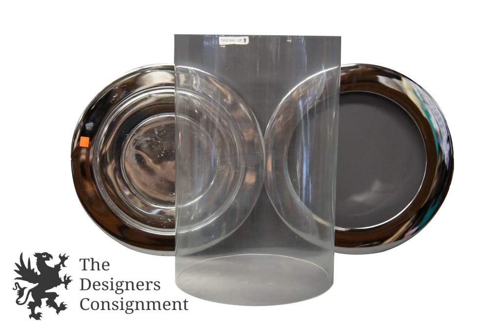 A unique over-sized hurricane candle holder. Features a large glass cover and chrome base with open lid. The glass is clear, but looks gray in the photos due to the background.