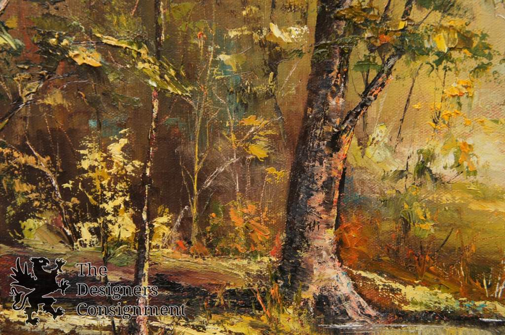 Ohio artist Carolyn Dixon (Grove City, Ohio, 20th century). Dixon is primarily known for her central and southern Ohio landscape scenes. This piece shows a beautiful gaze into the woods over a river. It is signed along the bottom right portion.