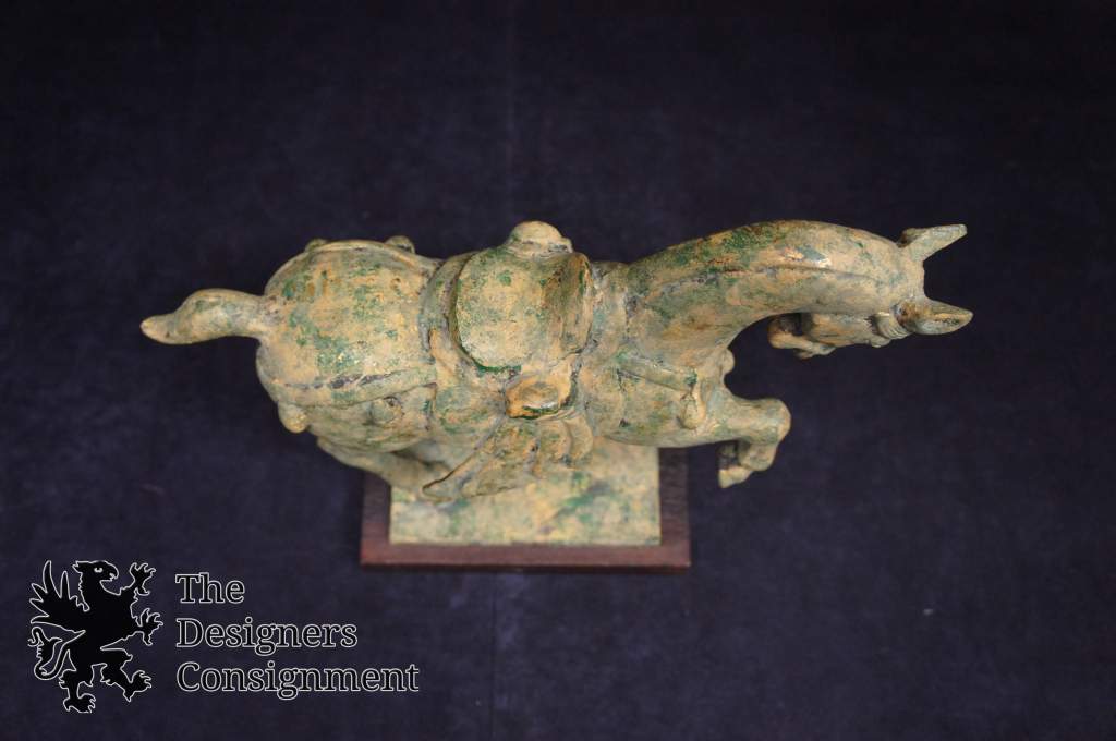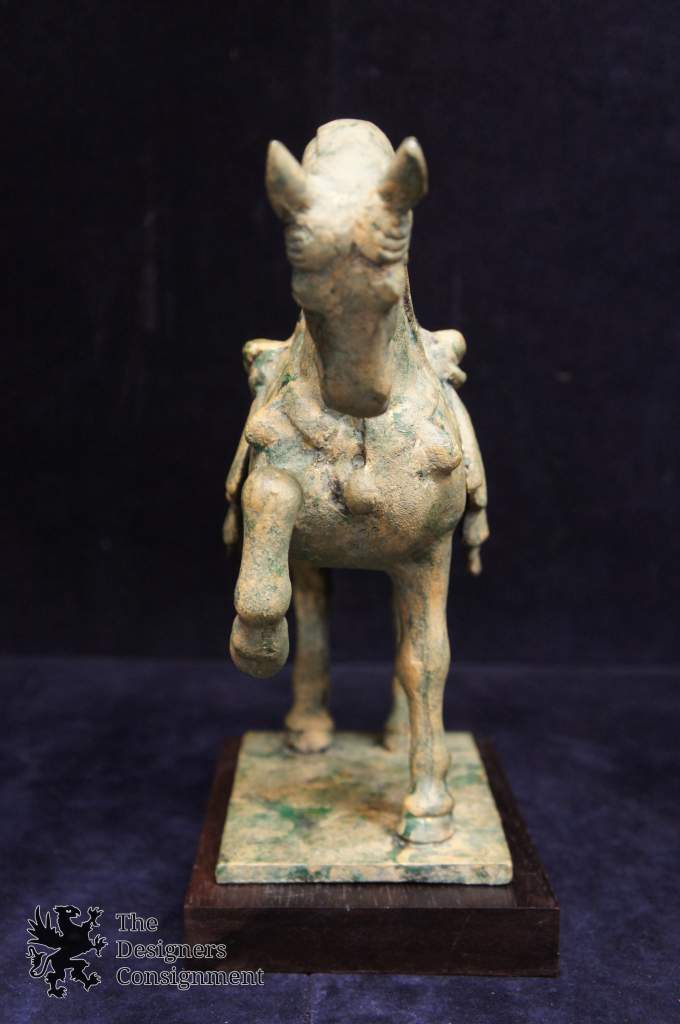 Mid 20th Century Tang Dynasty style Horse Figure. Made from Cast bronze with lovely patina. Comes with wooden stand. Marked Japan along the base.