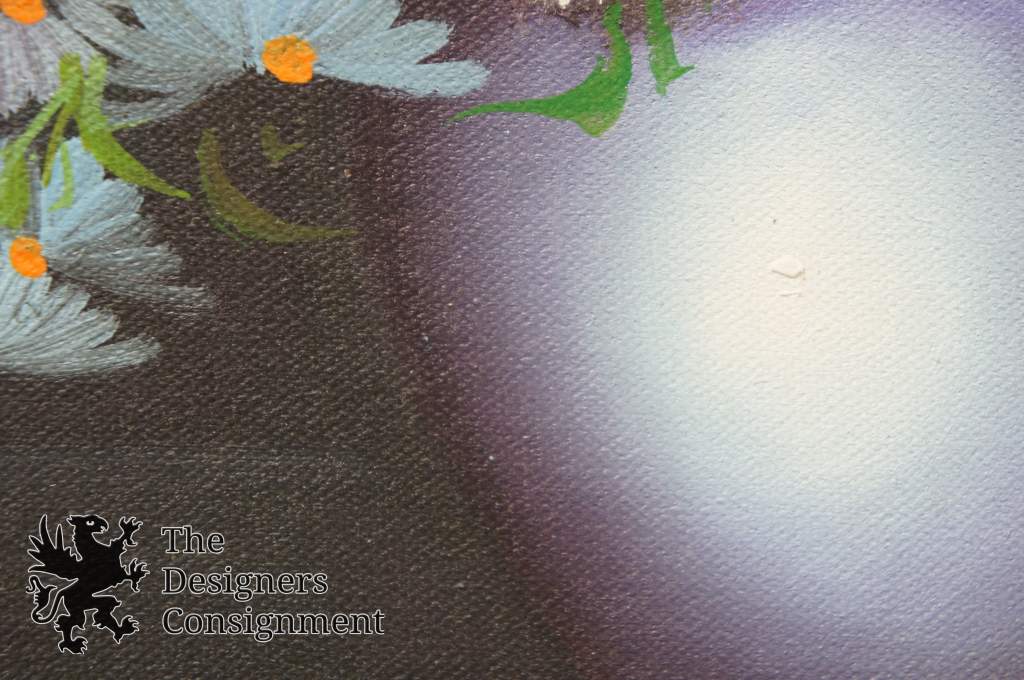 A beautiful still life by what appears to be a Karen Young work. Karen is an eastern inspired artist. The piece features a purple ceramic pot full off elegant daises on a blue background.
