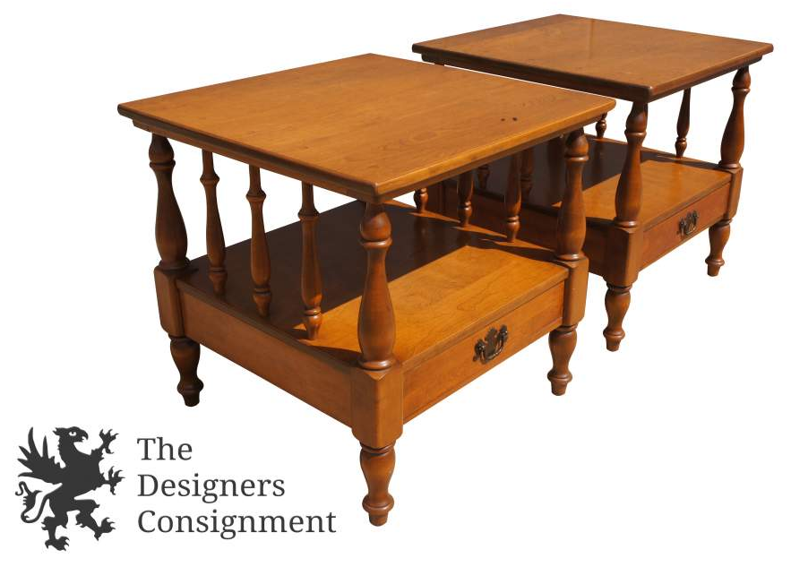 Early American Style Baumritter Side Tables. Open bottom with spindle accents and colonial brass hardware.