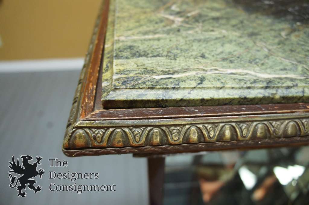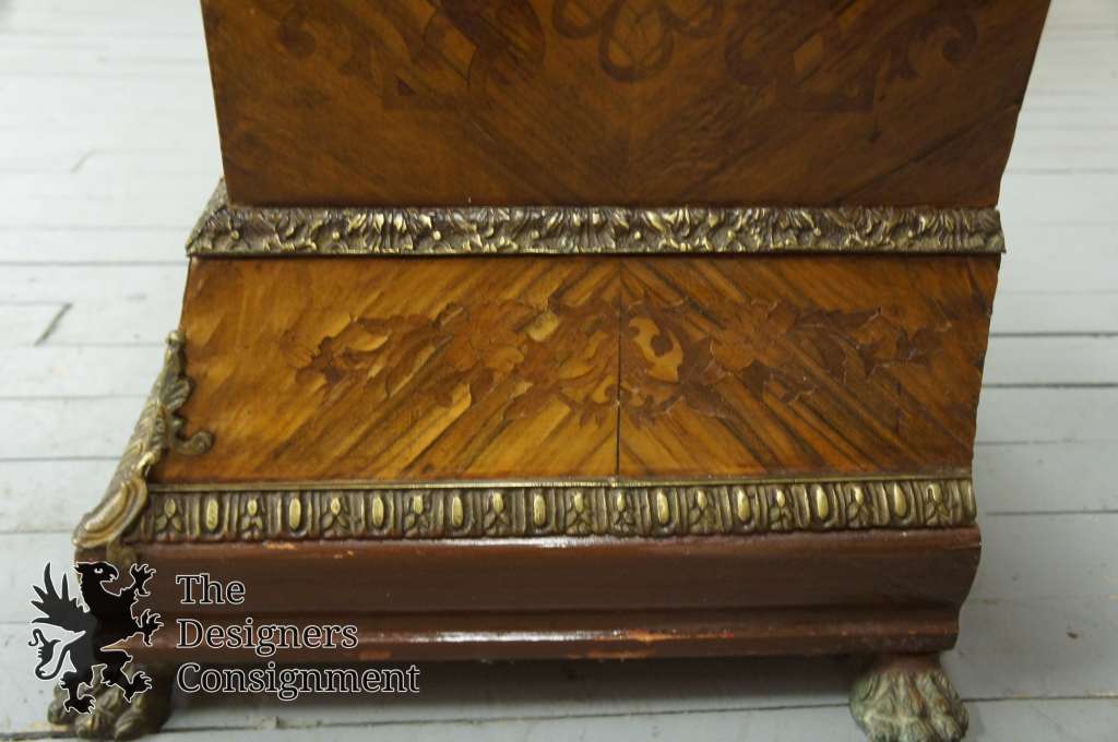 A magnificent Dutch Marquetry style pedestal and glass front curio cabinet. The entire piece is ordained with parquetry inlay and brass gadrooned hardware. Features a marble top and claw feet. Inside compartment is glass lined with 4 shelves and a locking door.