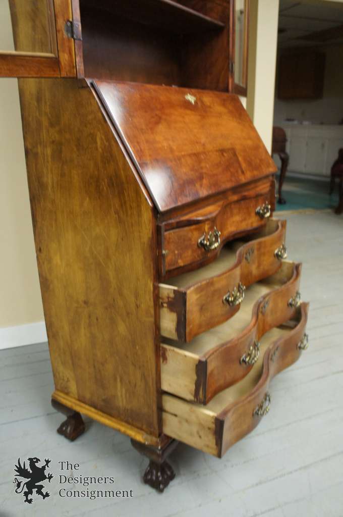 A lovely secretary desk with bookcase. Features an open pediment top, oxbow front and ball & claw feet. Bookcase features 2 fixed shelves. Slant top opens to reveal writing surface, 3 drawers and pigeon holes for storage. A great addition to any setting.