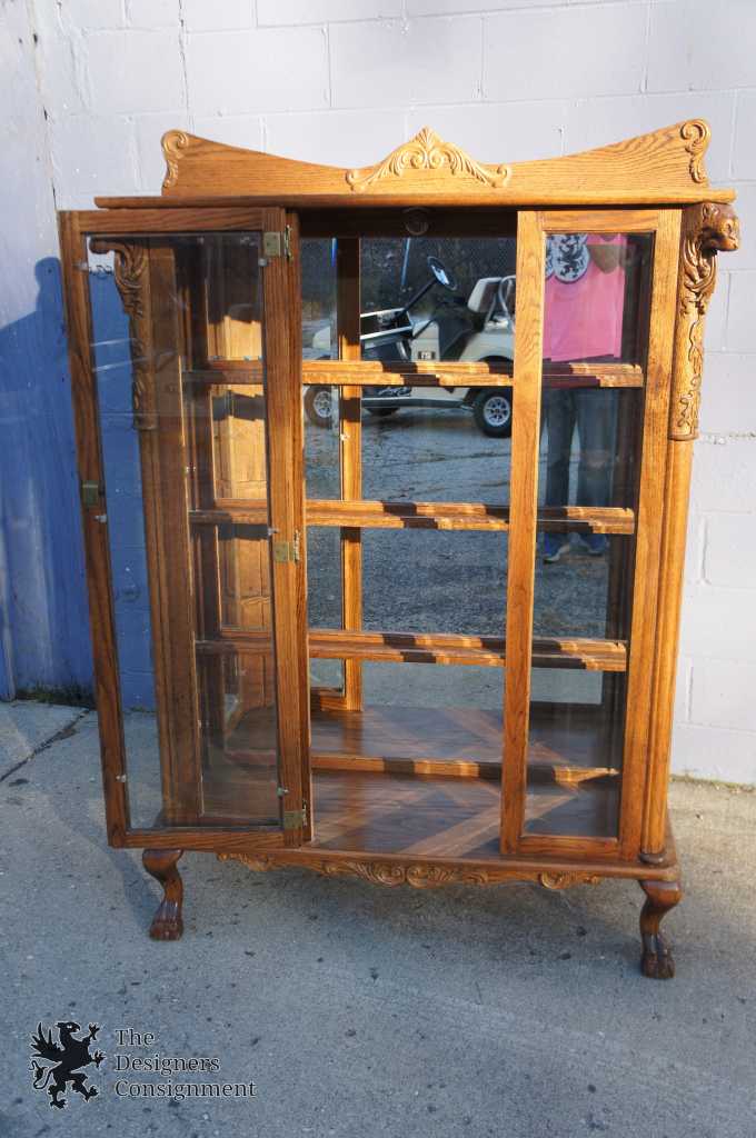 A beautiful glass front bookcase with lions carved along the sides. Made around towards the middle of the 20th century. Features beveled glass along the front and sides. Back-splash is serpentine with floral trim, matching the lower apron that leads to paw feet. A fantastic addition to any collection.