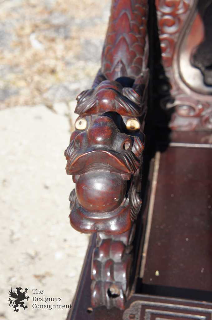 Exquisite 1920s Chinese import dragon bench. Made from Rosewood with high relief carved accents. From top to bottom this piece is ordained with dragons. The crown is pierced with a serpentine dragon scrolling through clouds. At the center of the lower back are two more dragons set within panels facing each other. A similar theme is continued throughout the piece. Winged dragons are set at the corners of the base offset by a face along the apron between. Arms are exceptionally detailed with scales and wings. Here the dragon is seen with a ball in his mouth. The arms and dragon along the crown each have bovine inlaid eyes. A testament to the exceptional craftsmanship. An Impressive overall design that will look great in any setting.