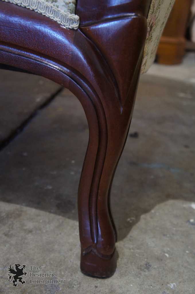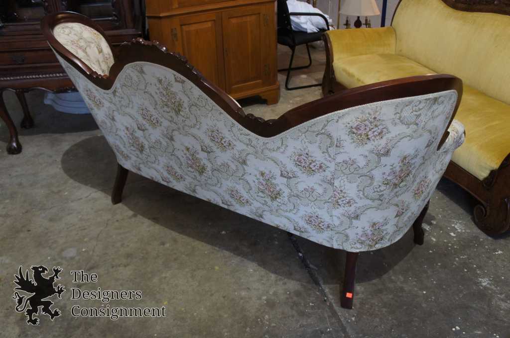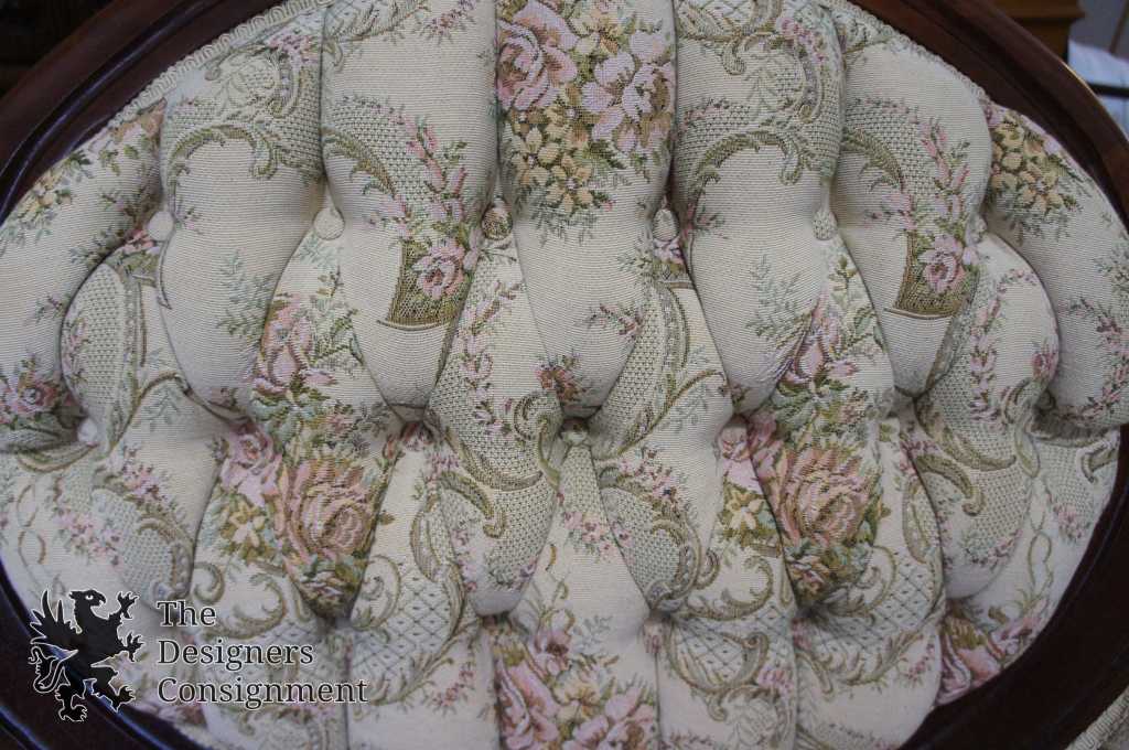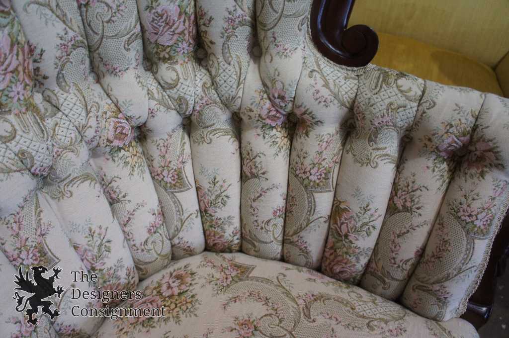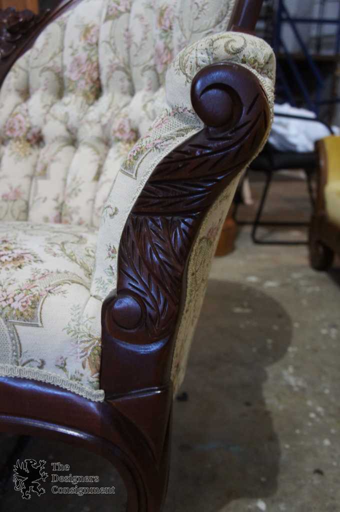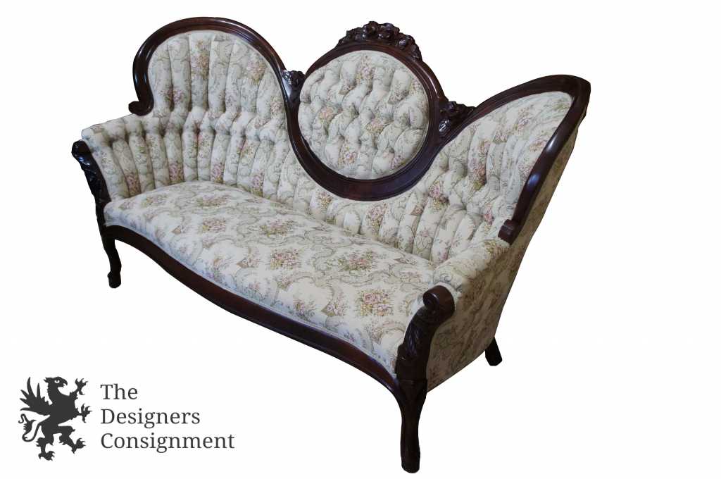 20th Century Victorian Reproduction Sofa. Made from what appears to be Mahogany, but quite possibly Rosewood with a beautifully countered carved swooping camel-back. The sofa is upholstered in beige aubusson style floral fabric with tufted back cushions. This piece has been comfort tested and is very enjoyable to sit on.