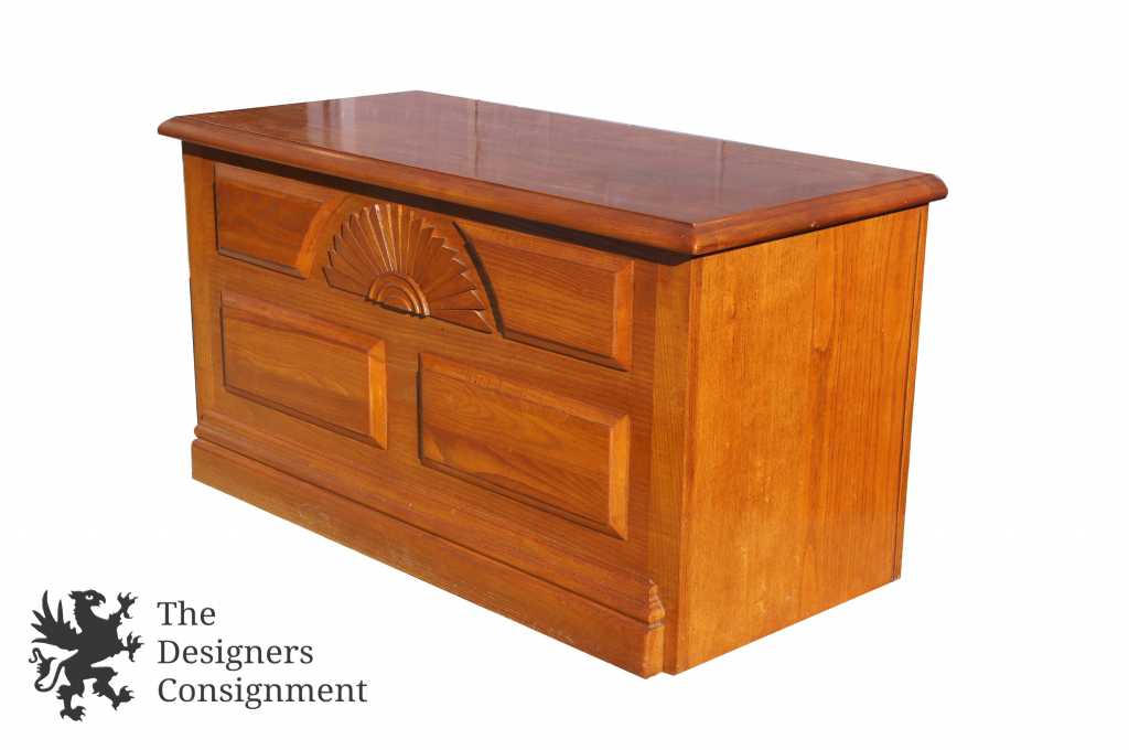 A lovely Ashwood chest made by Stanley Furniture Company. Features a hinged lid and sunburst design along the front. The perfect bedside addition to any space.