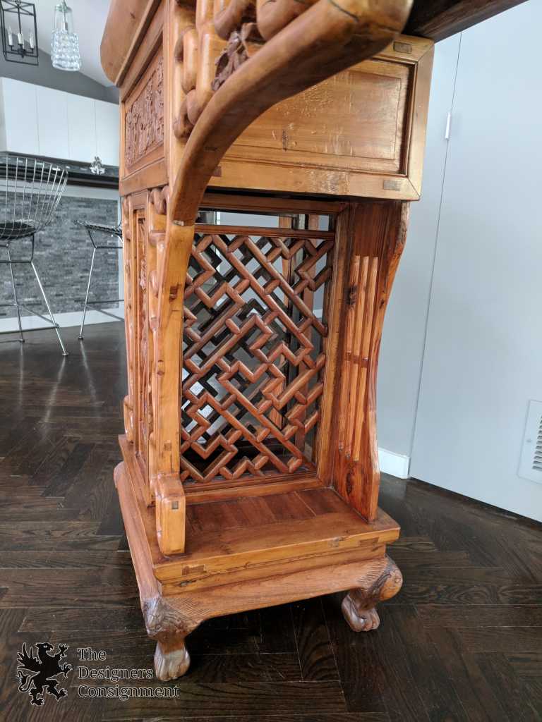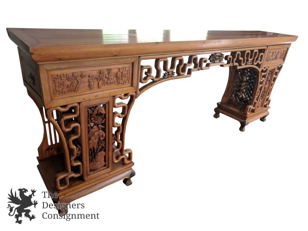 Up for consideration is a meticulously detailed Chinese console table. Circa 1850-1899, Qing Dynasty. Made from Elm with dovetailed construction. The elongated table with drawer on each side breaks down into 4 pieces for ease of moment. Features a pierced and scrolled front with with landscape carved scenes with villagers and cranes. At the very center a squirrel can be scene amongst berries and nuts. The table is supported on each side by 4 paw feet. Along the side there's an open geometric design allowing one to see the intricacies of the painstaking craftsmanship. An amazing oerall piece that will make a great addition to any setting.