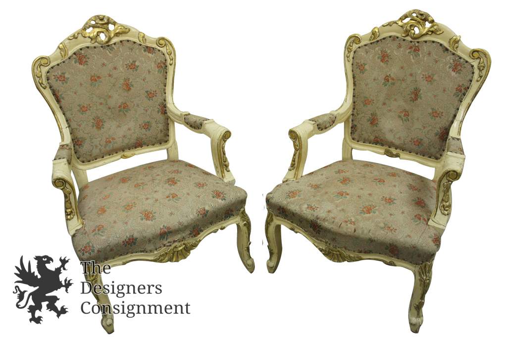 Antique Louis XV/ French Provincial style accent chairs. An off-whiteover sizedframe with gold painted accents. Floral upholstered with Rose accents.