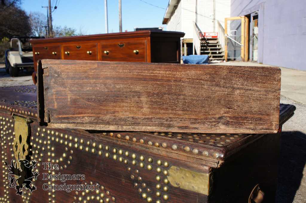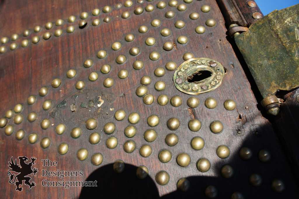 A gorgeous 18th Century Coffer. Spanish or Moroccan Style. Made from a solid wood with brass hardware. The entire front and top are studded giving it a one of a kind look. Features 3 lower dove tailed drawers. The clasp is elongated with embossed bulls eye pattern. Interior is open with a side compartment for additional storage. Top can be left open resting on the open door of the side compartment. A great statement piece for any space.