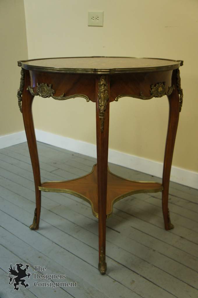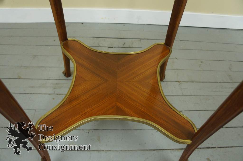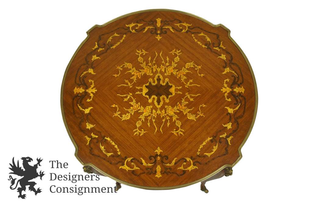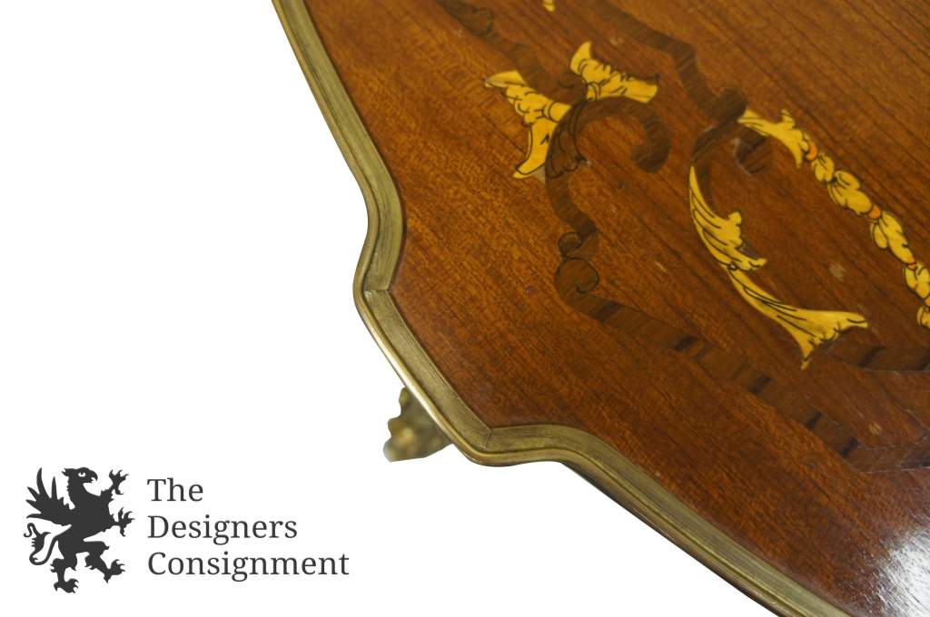 Beautiful Louis XV style Mahogany Side Table. A Marquetry top with fruitwood inlay. V grain veneer pattern throughout. Mounted withscallopedbrass hardware. The perfect addition to any room.