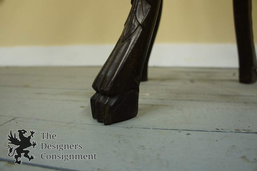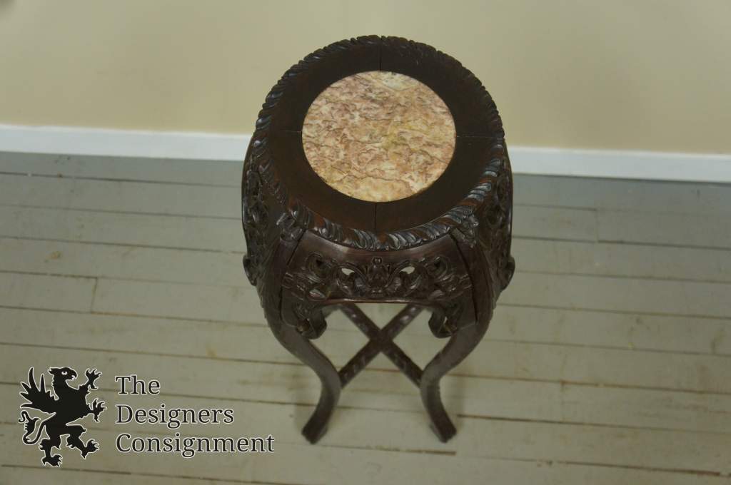 A beautiful estate piece. Featured is a carved ebony plant stand with a lovely floral motif, claw feet and marble inlaid top. Great for any setting.