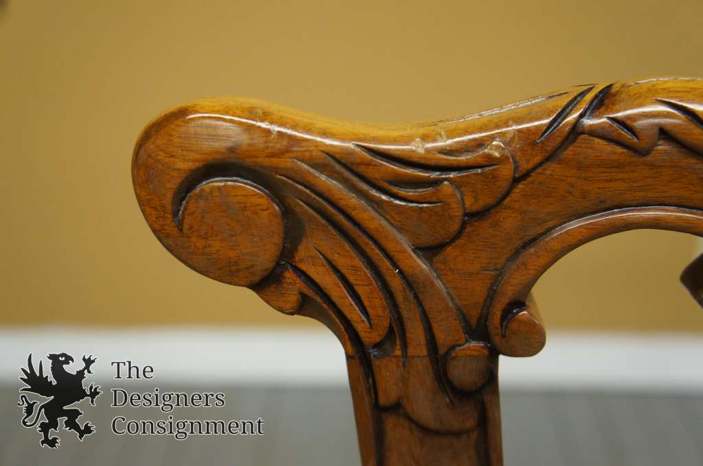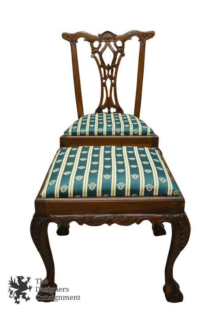 A beautiful Chair and accent stool in Chippendale Styling. Made from Mahogany with acanthus carved detail and ball & claw feet. Upholstered in a green and light yellow stripe. The seat cushions remove for ease of re-upholstery.