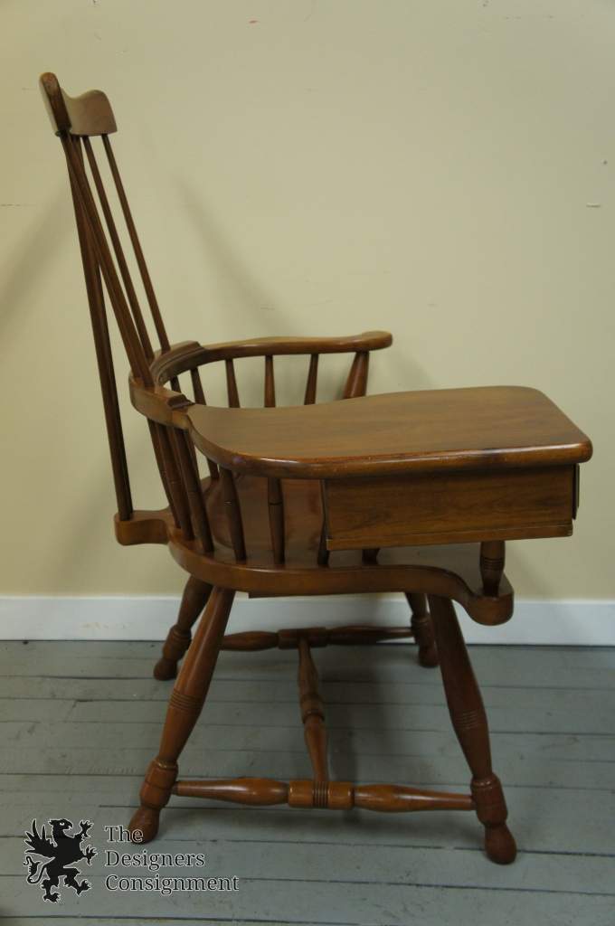 Comb Back Windsor Writing Chair by Pennsylvania House. Made from maple with beautiful spindles and drawer underneath the writing arm. The seat is contoured perfectly for comfort. Chair originally had a lower drawer underneath the seat as well. Something we could have made for you if interested. This chair will be Hand Delivered via White Glove Service and Carried into your home.