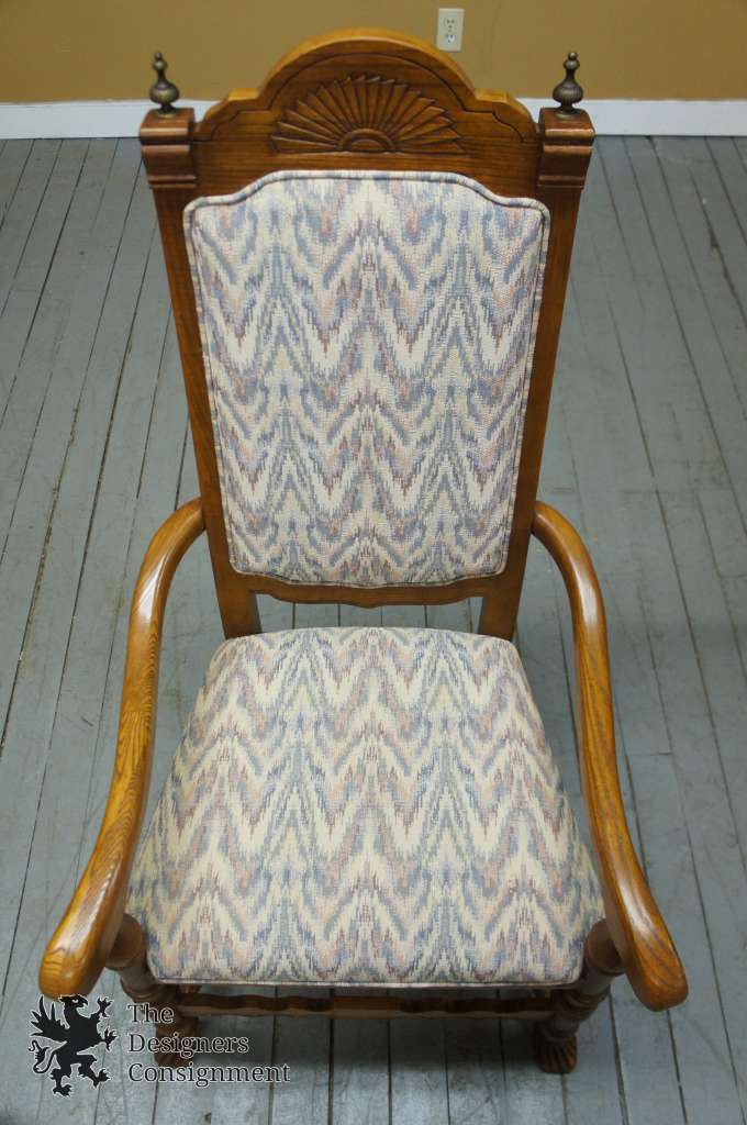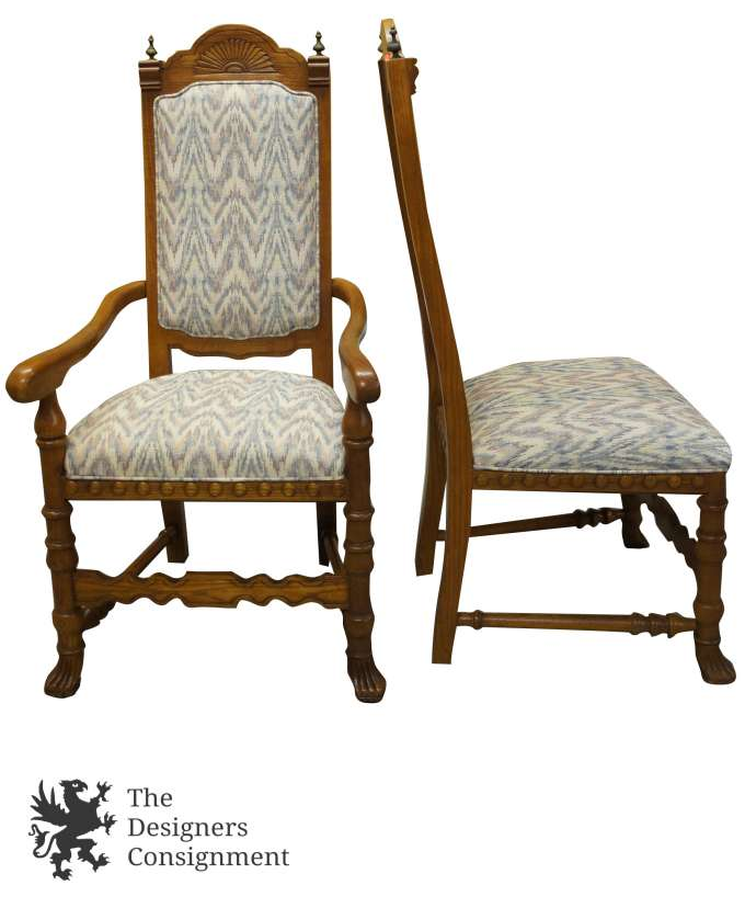 A gorgeous set of 6 chairs. Part of Stanley Furniture's San Marcos Collection. Jacobean style with Cane back and upholstered seat. Each chairfeaturesa sunburst along the top of the back, hobnails boarding the trim beneath the seat and claw feet. The legs and side stretchers arebeautifully turned. In addition there are finials flanking the top of each back and a unique serpentine engraved stretcher along the front. A remarkable set that will look great in any space.