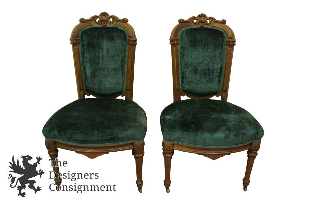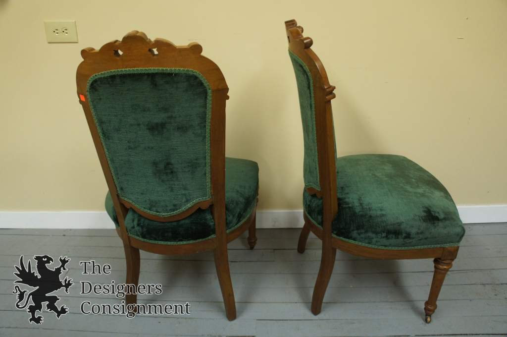 Elegant pair of Victorian Parlor Chairs. Made from Walnut with burled accents. Upholstered in Green. Each chair features an ornately carved backing. The chair on the right has a trim panel missing on the upper left side of the back, just above the upholstery. If interested we could have this repaired before shipping.