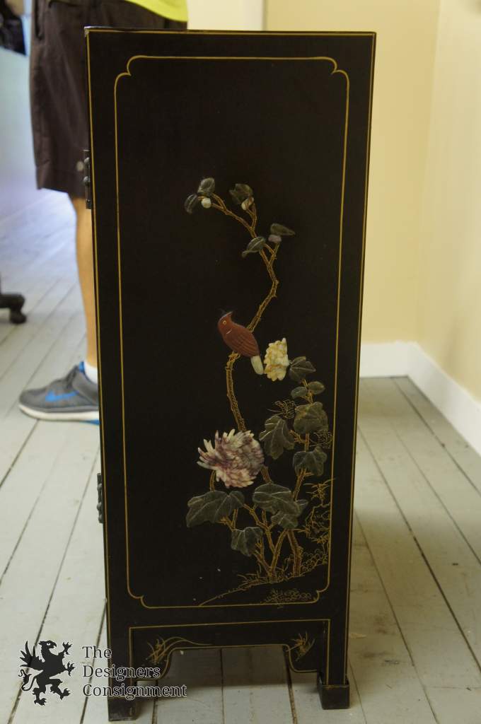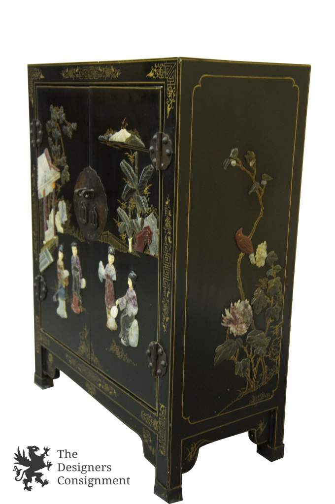 Chinese Jinlong Furniture Lacquered Low Cabinet: Double Doors Open to Single Shelf. Each side features Carved Hardstone; Geisha in front of pagoda along the front and birds with flowers on the sides. Sides and Top Have Detailed Painted Design Outlined in Gold. Matte Black Lacquer with Hasp/Locking Pin Closure (Pin Missing). Jinlong Sticker with Dragon on Reverse