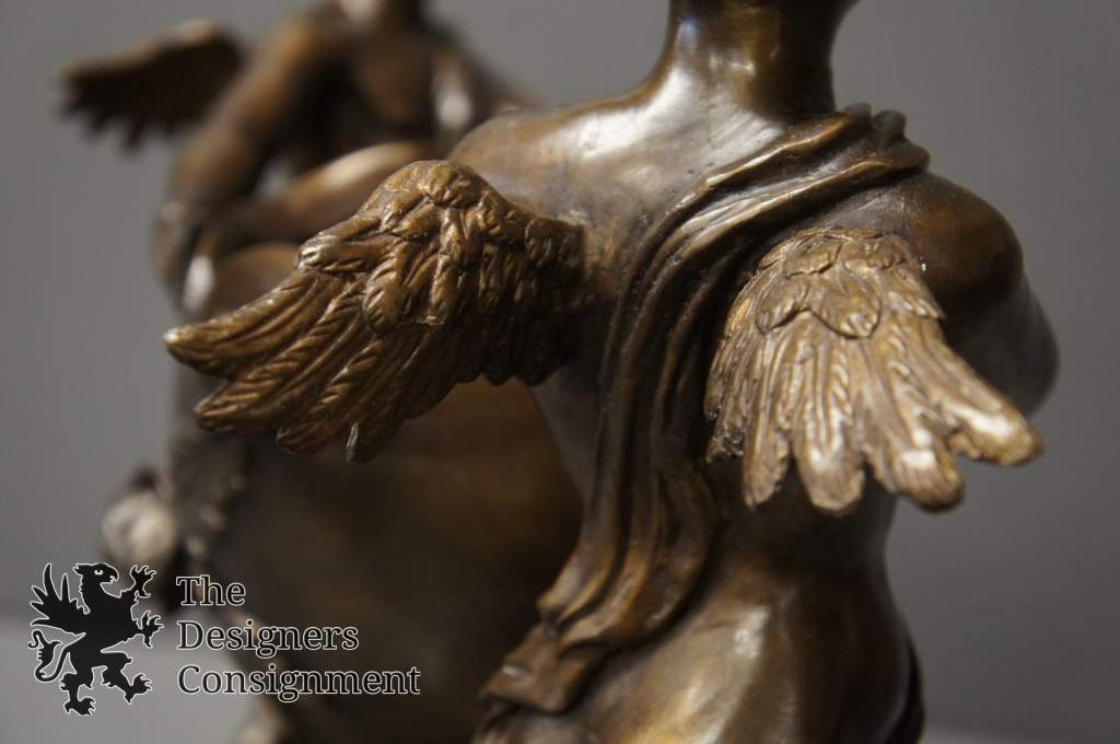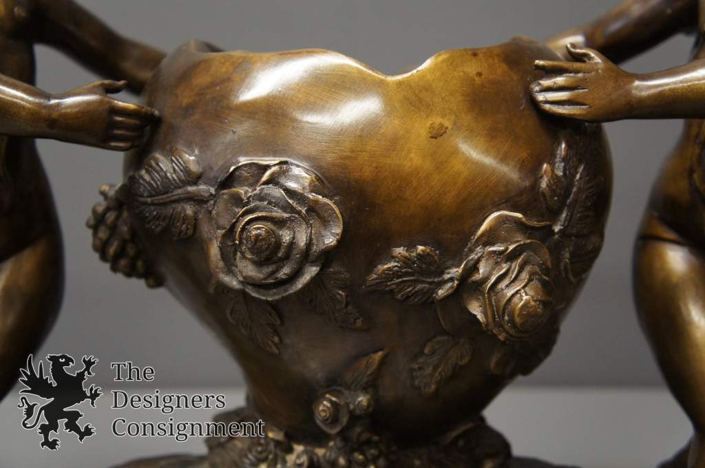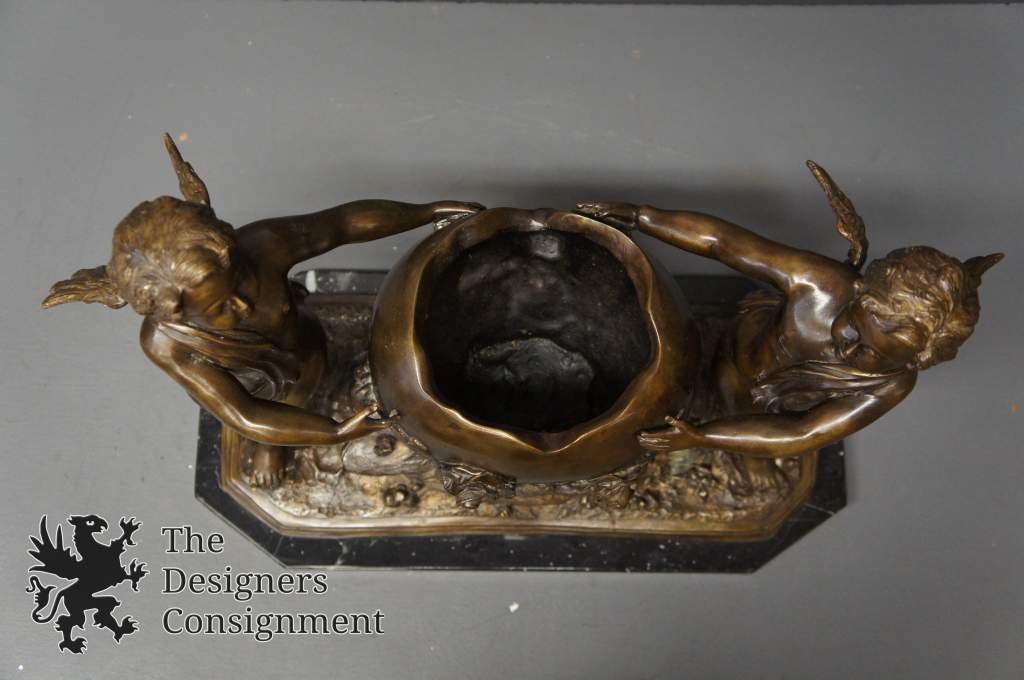A gorgeous early 20th century bronze centerpiece. Featured are 2 cherubs looking in each-others direction while grabbing hold of a rose covered planter. The planter is poised on top of a cascading rocks that lead down towards the marble base. A great piece for display in any setting.