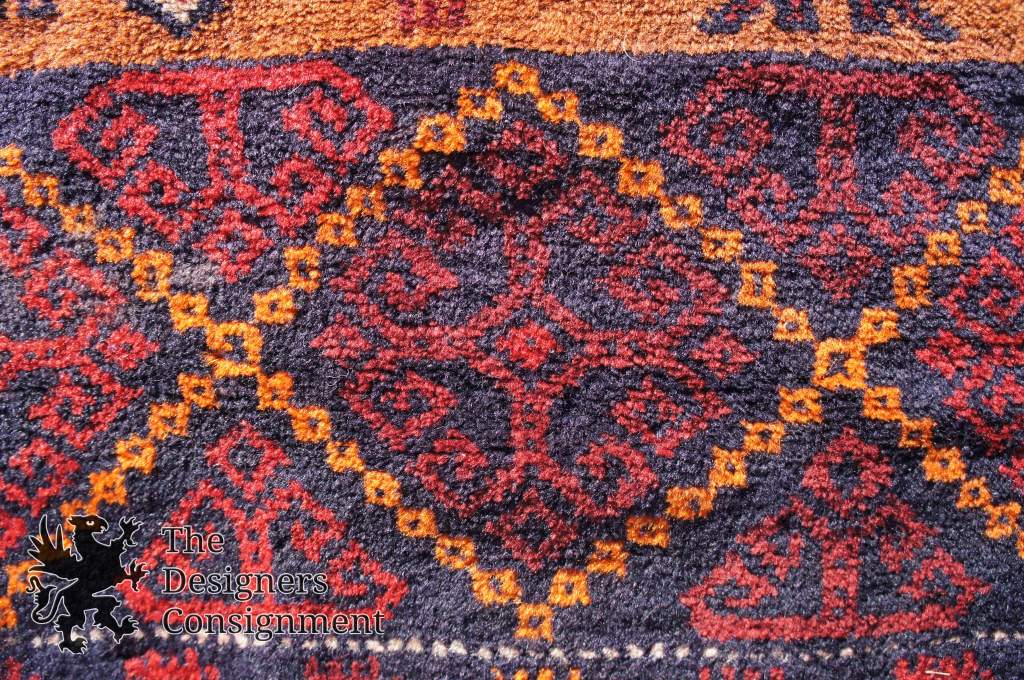 Abeautifullydesigned prayer rug. Orange red and purple in a geometric diamond pattern. Very durable.
