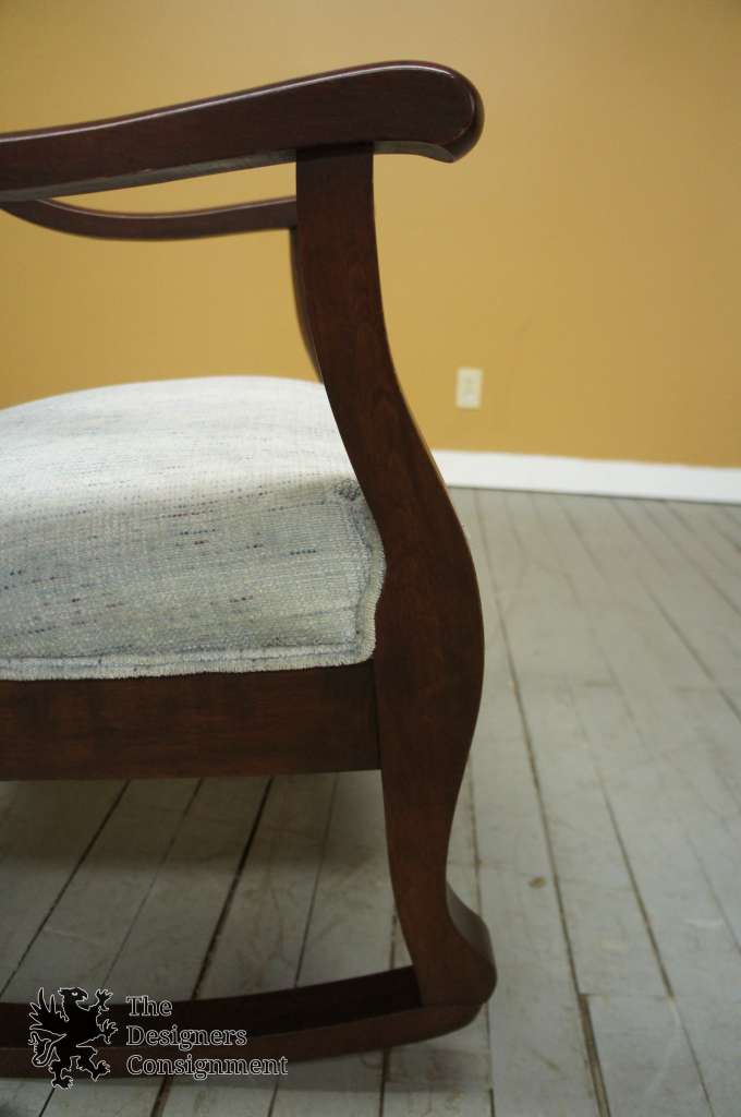 Early 20th Century Mahogany Rocker, upholstered in a light blue. Features a mix of Queen Anne and Victorian styling. Sleek lines with a smooth finish. Parlor set available and pictured below. This includes the rocker, a settee, 2 arm chairs and agentlemanchair with ottoman.
