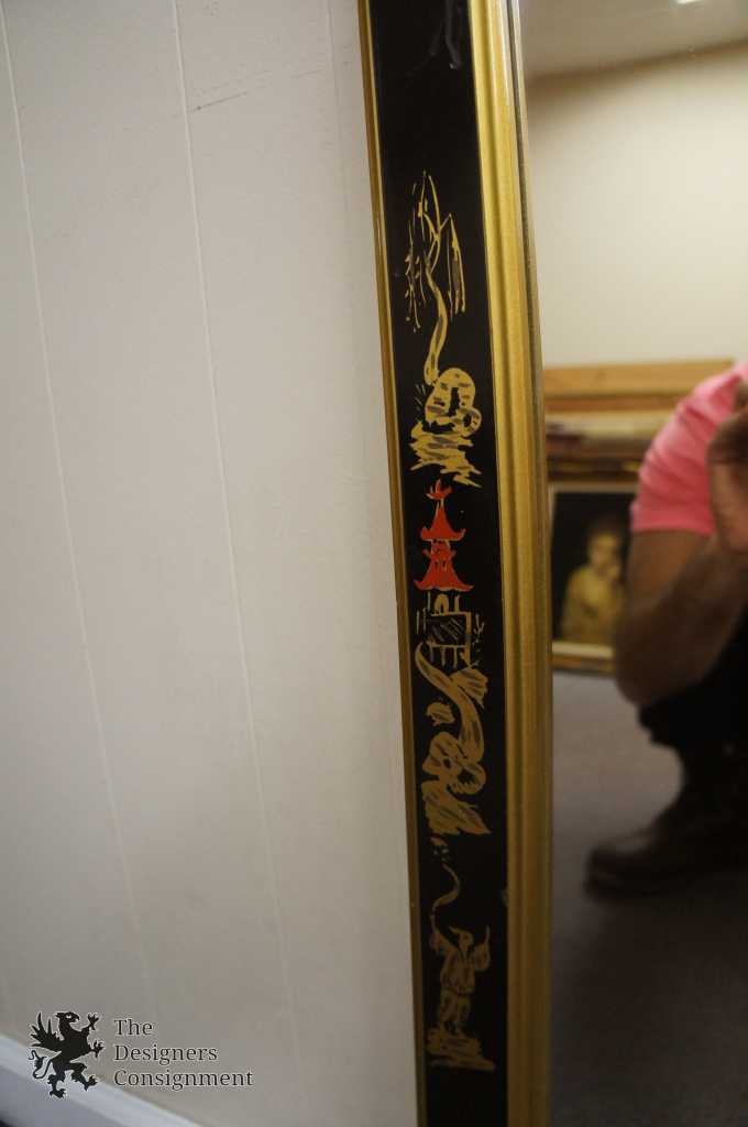 A neat dressing mirror. Chinoiserie styling with a black frame and gold trim. This mirror is most likely made by Drexel, however the sticker is missing.
