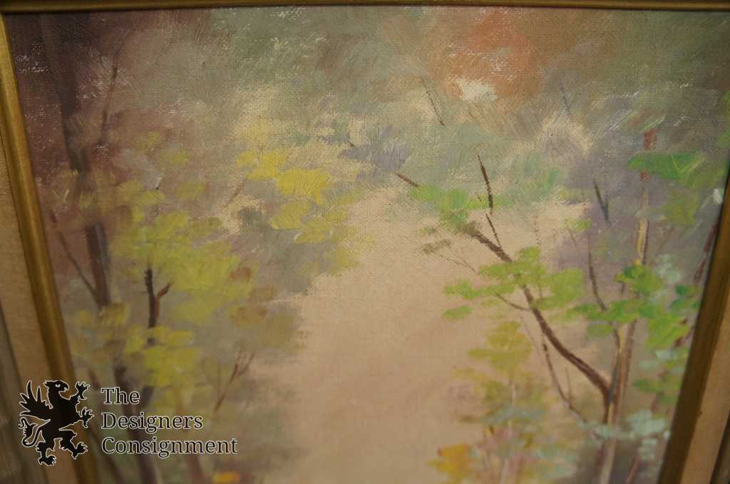 A neat oil landscape showing a woodland setting with a man and his dog by their cottage. The piece is signed Elyse. Framed in wood with gold trim.
