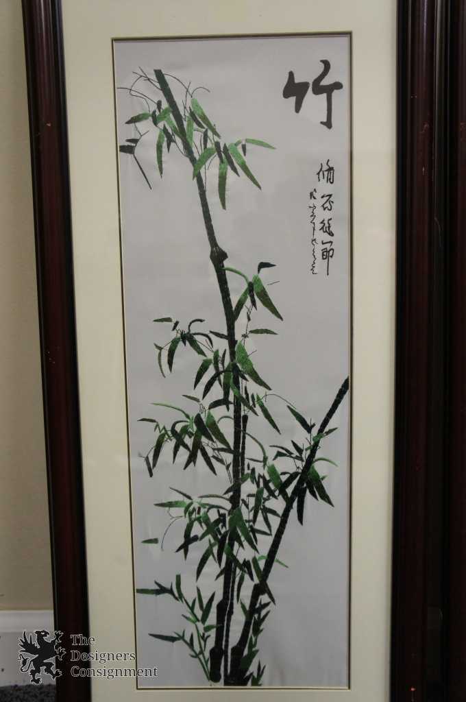Here we have a pair of Japanese embroidered linens in framed. Each is signed in stitch. One shows a plum tree, and the other bamboo.