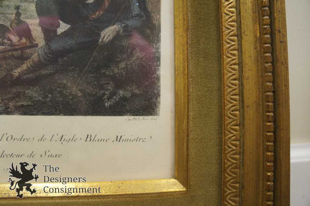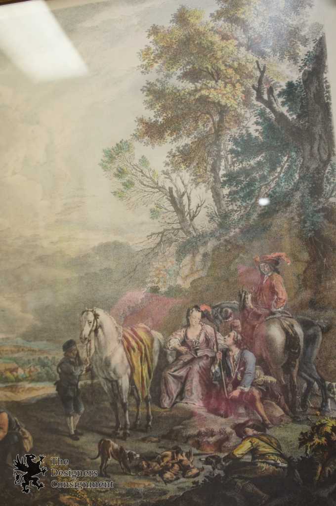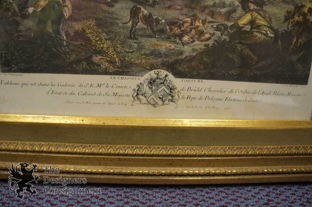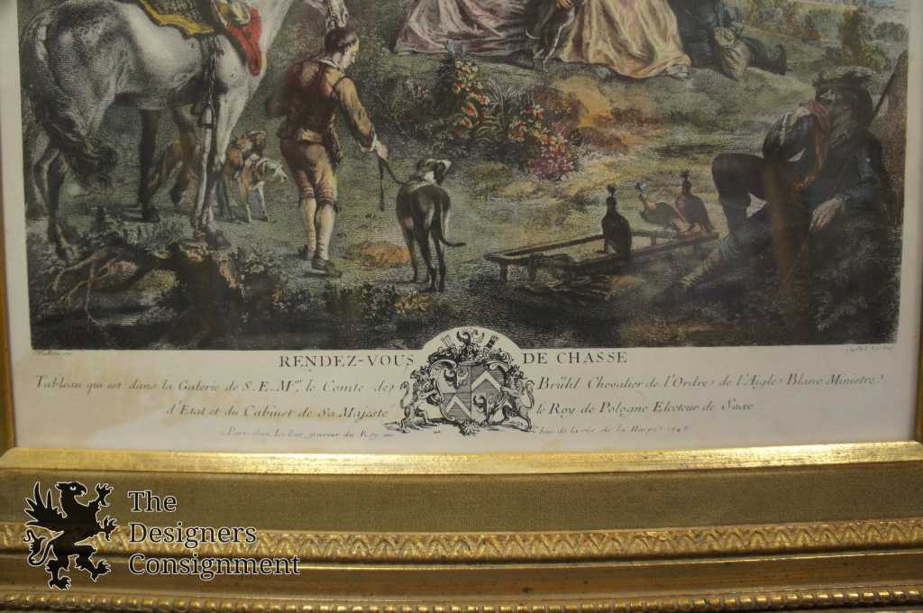 Original Colored Engravings by Jacques-Philippe LE BAS (1707-1783) after Carel Van Falens (RENDEZ-VOUS DE CHASSE & Le CHASSEUR FORTUNE). Engraved in 1745 with the chisel and the dry point of eighteenth century. The pair is framed in a gold finished wood with felt mat. A great addition to any setting.