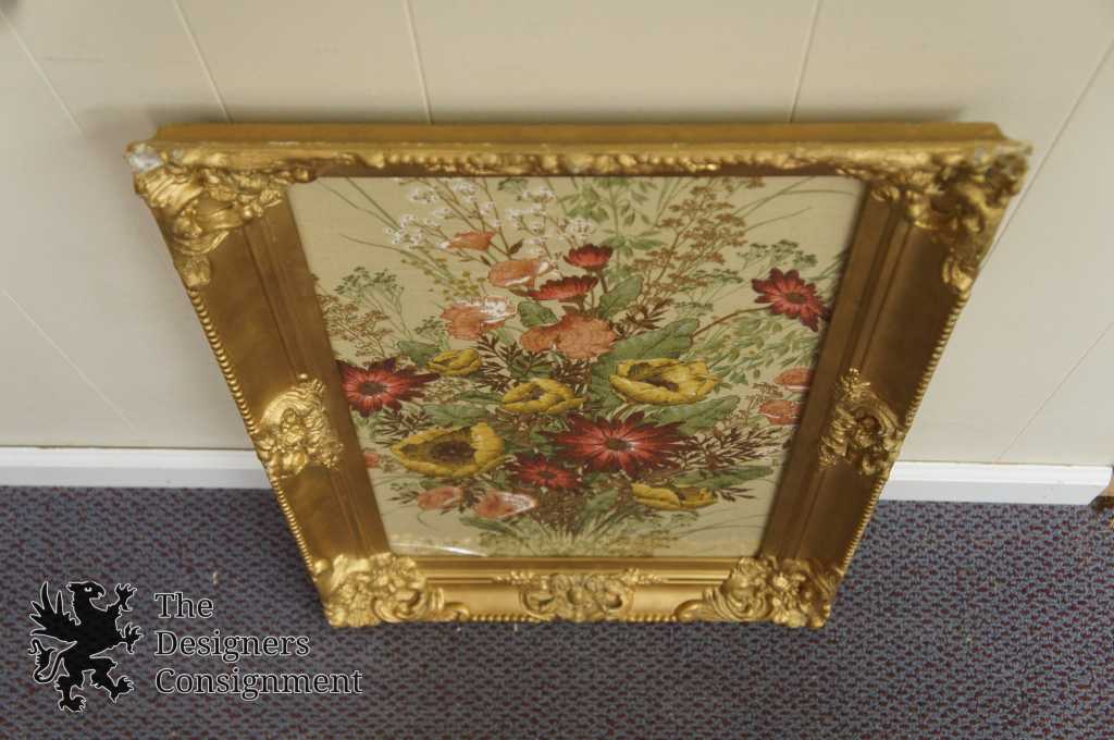 A lovely floral printed linen within a gold regency style frame. The piece is covered with glass. A nice addition to any setting.