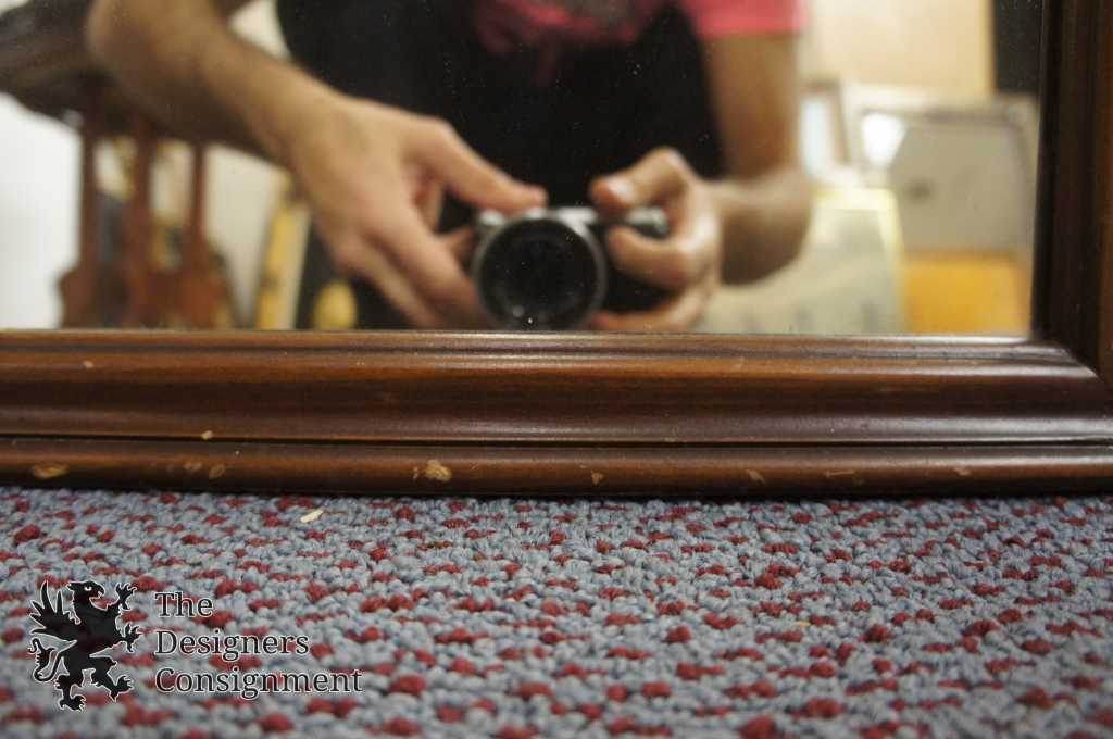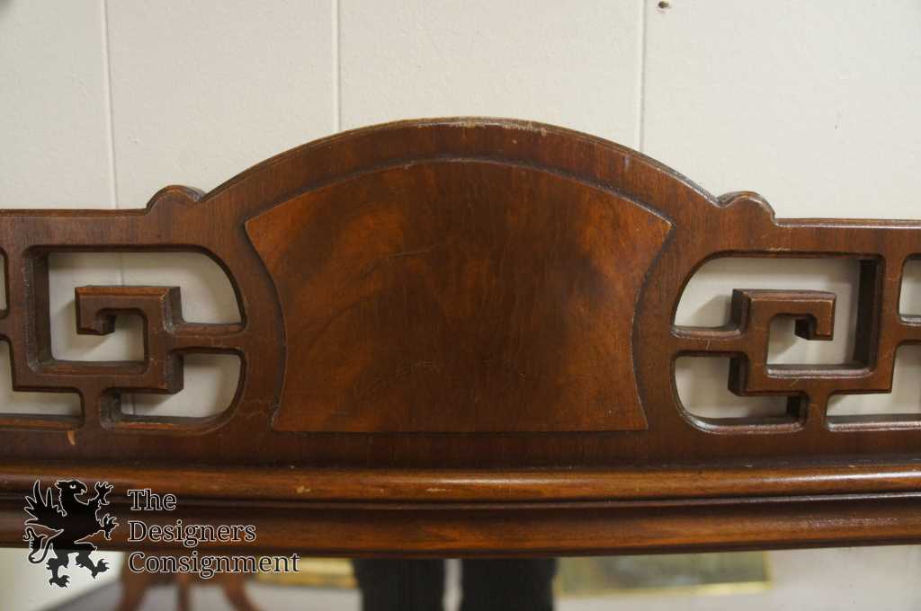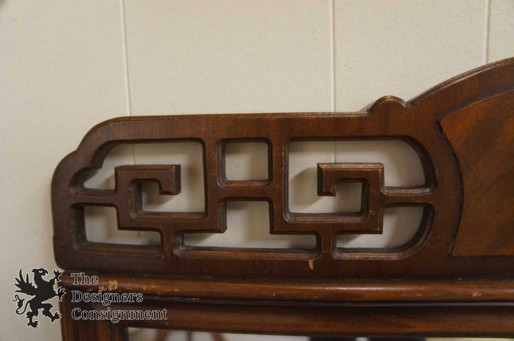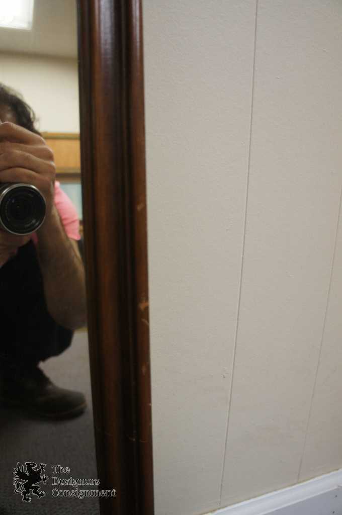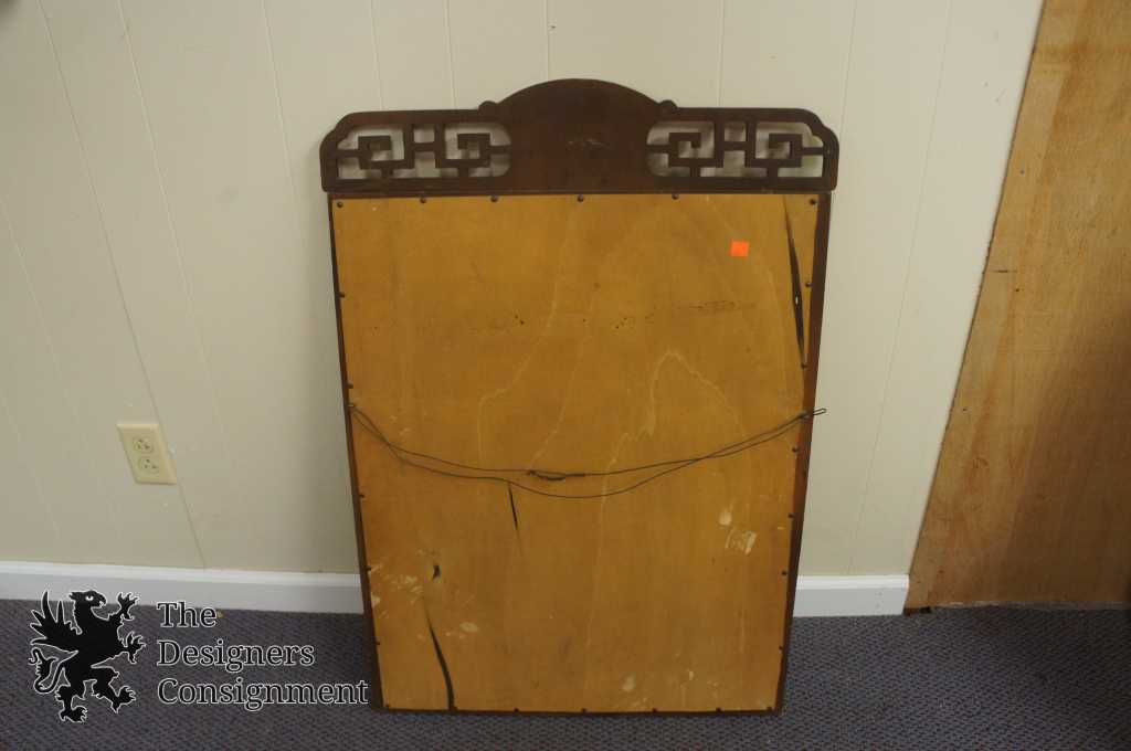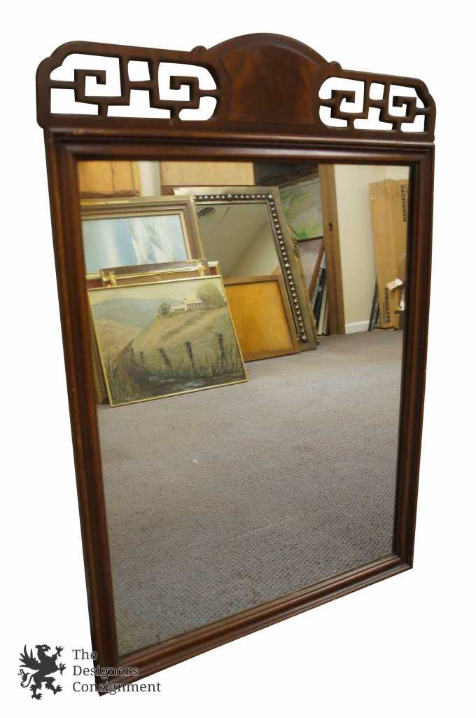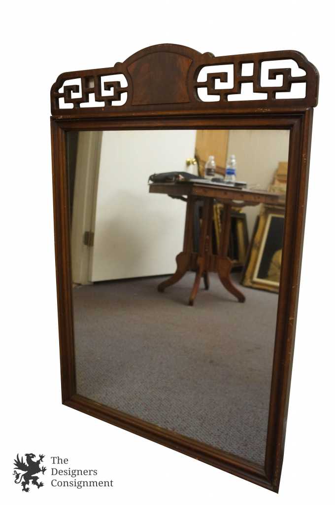 Oriental style Mahogany wall hanging mirror. Rectangular shaped with classic Asian styling along the top.