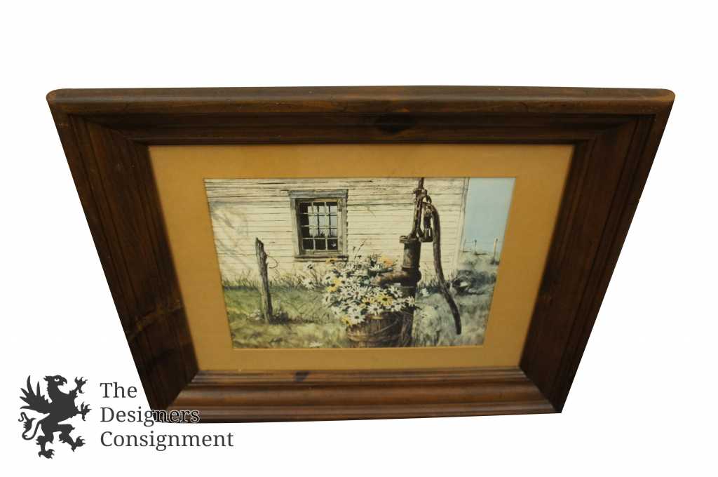 Features a nice farm landscape with water-pump, a barn side, a half barrel of flowers, and a broken barbed wire fence.