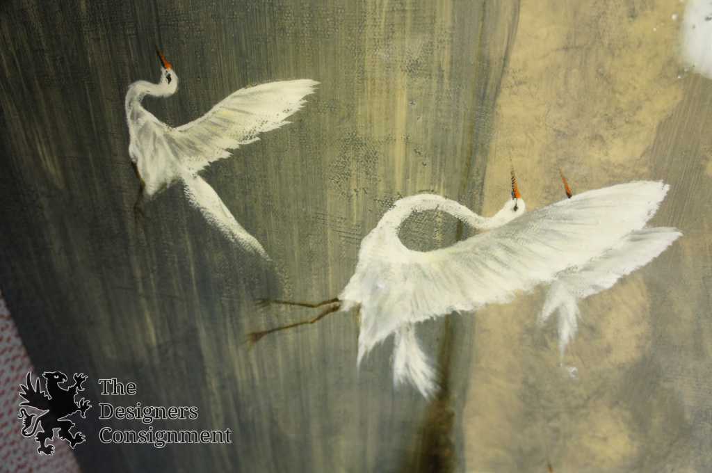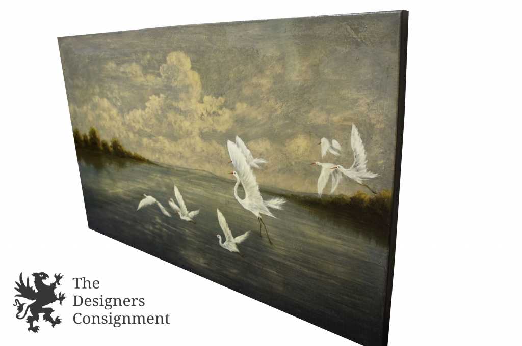 Vintage Oil on Canvas Painting Landscape Lake with White Cranes Water Birds 232735288816