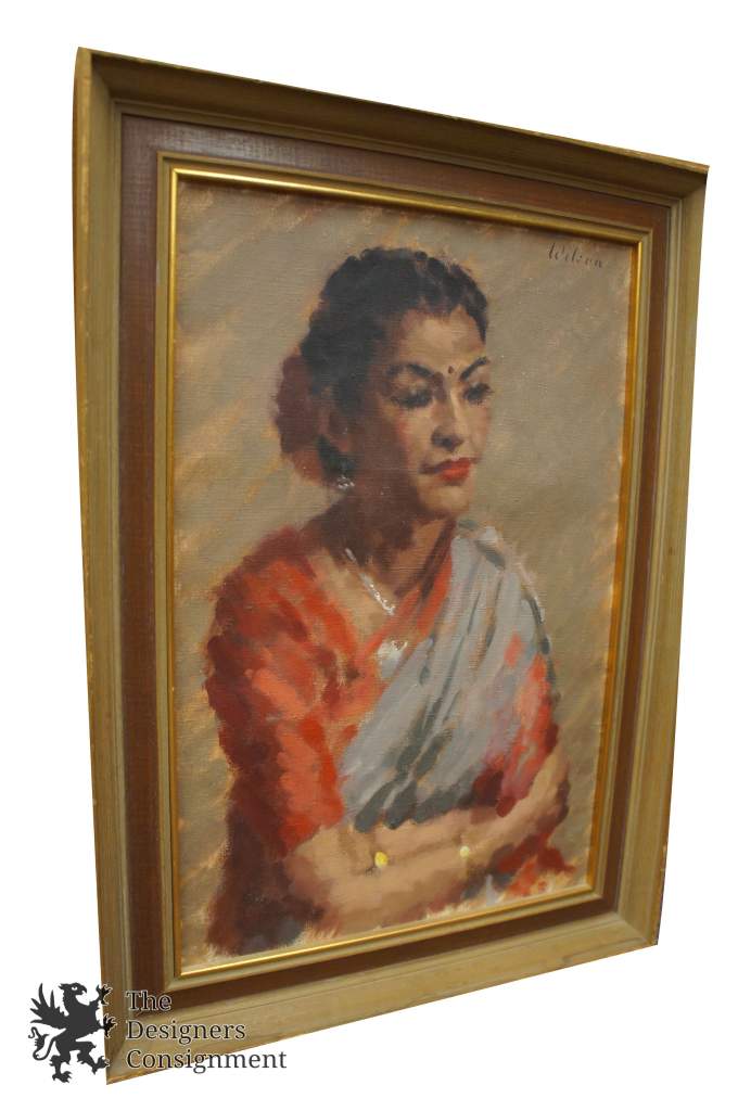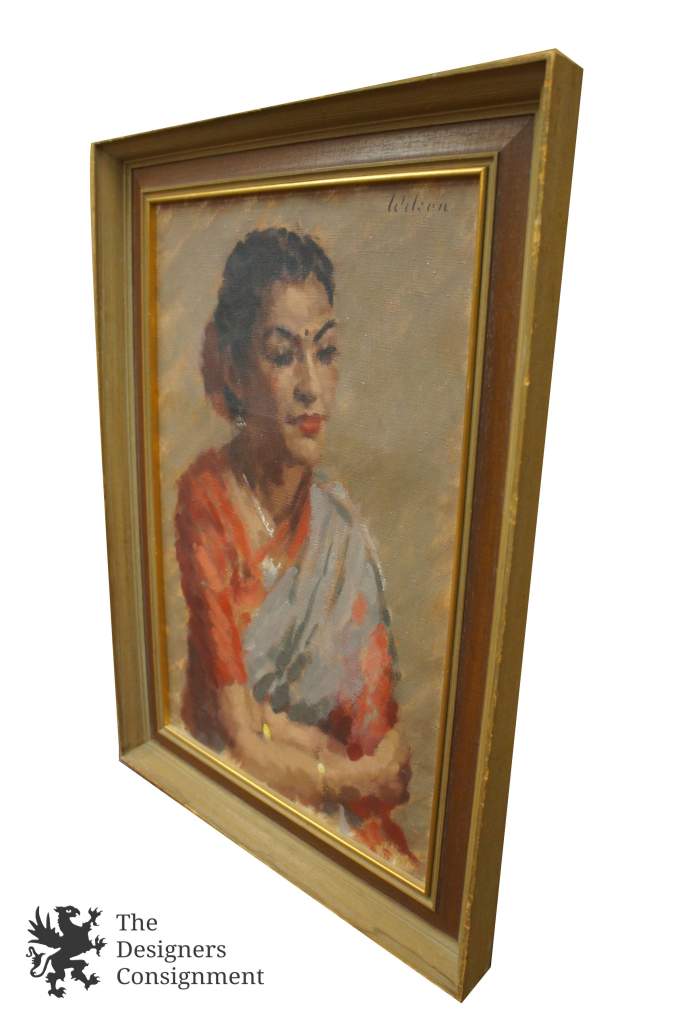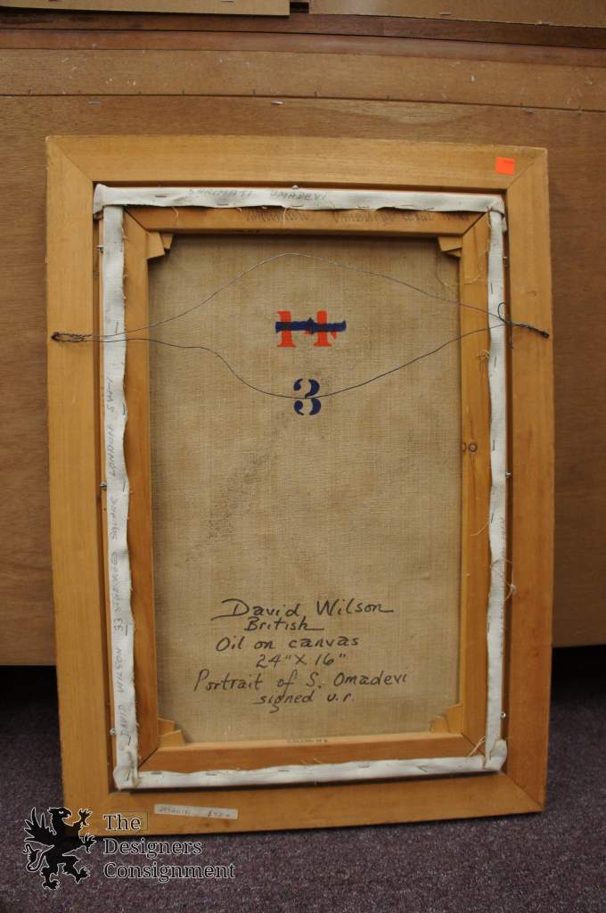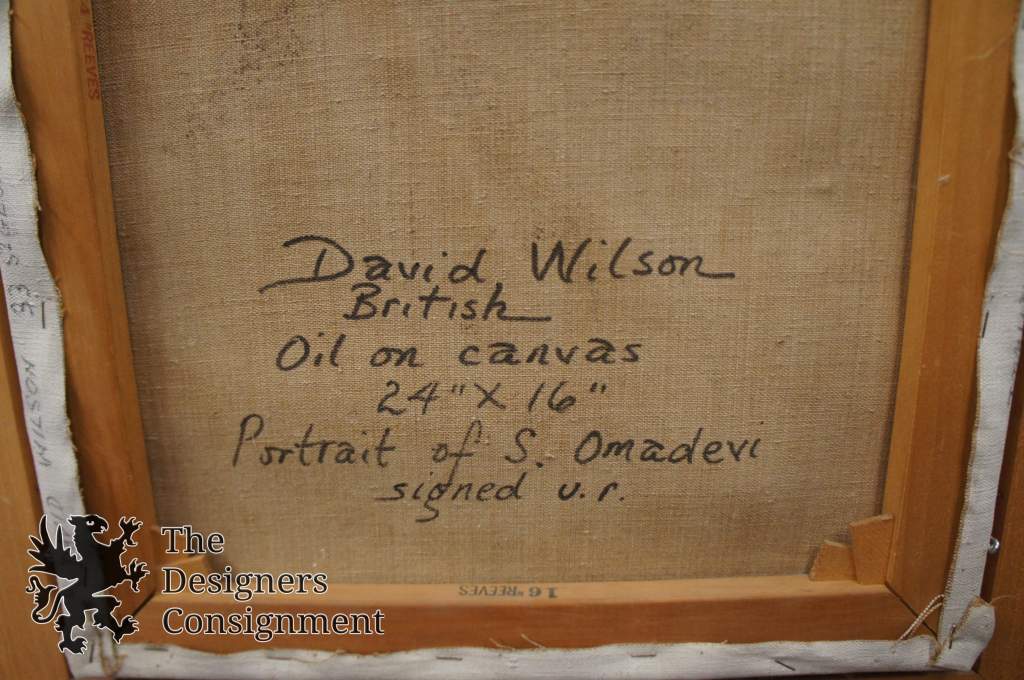 Beautiful oil portrait by David Wilson. David was known for his portraits. Another example and auction record can be seen below. This piece features a noble woman by the name of Shrimati Uma Devi who lived from 1876-1936. Exquisitelines and color. Signed in the upper right. This paintingis extensively marked up on the back, showing where it came from or possibly exhibited in St Georges Square London Sw-1. Bio down below.