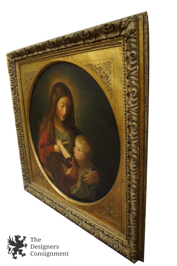 A very fine 19th century depiction of Madonna, infant and John the Baptist. Massive circular oil on canvas with exceptional detail in stately gold leaf frame. Due to its size this piece will be hand delivered via White Glove Service.