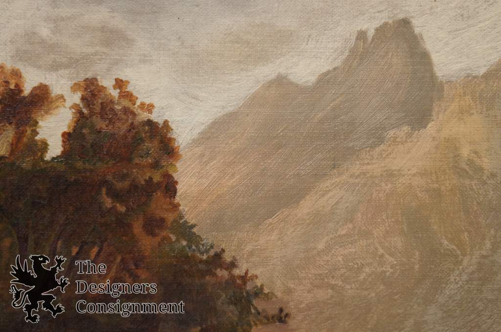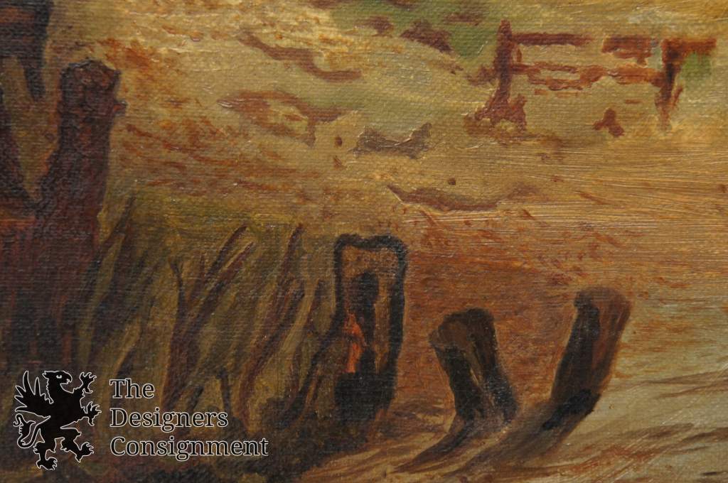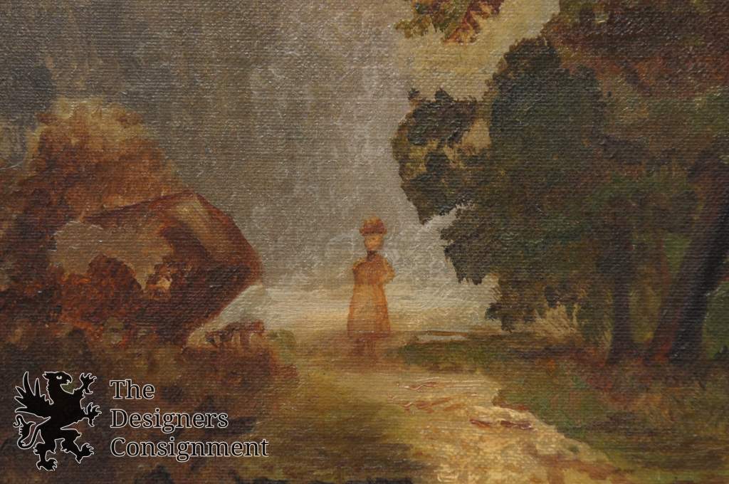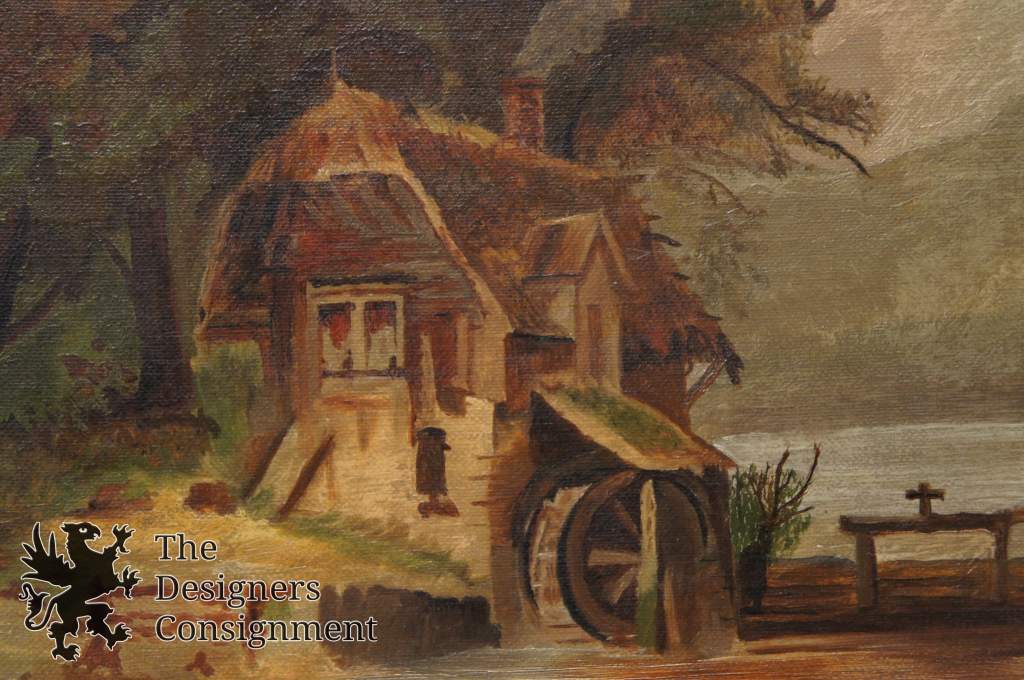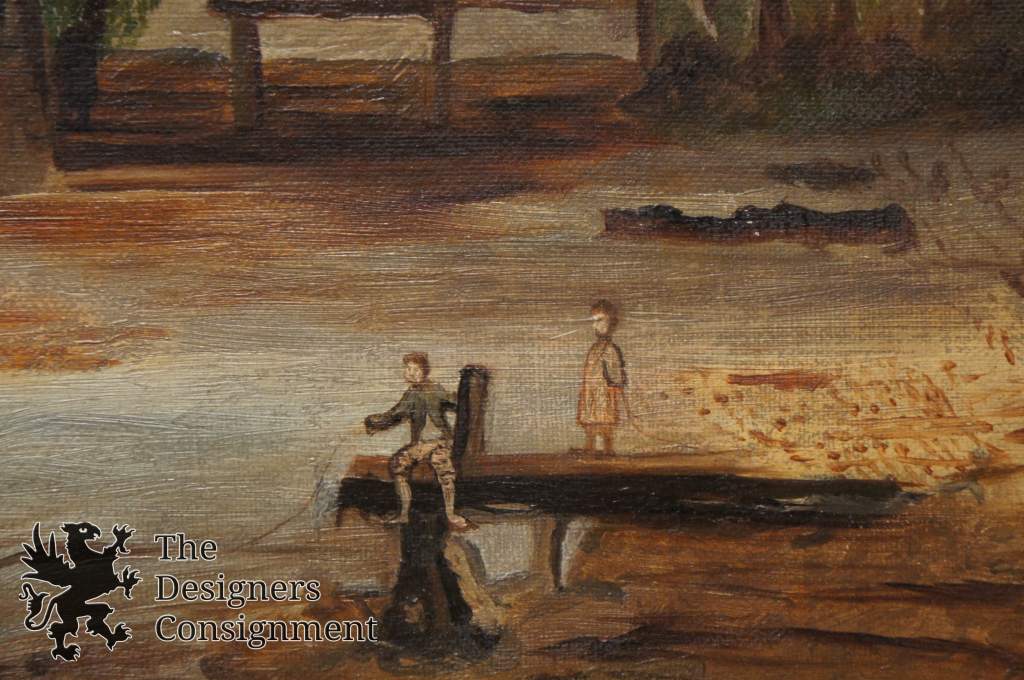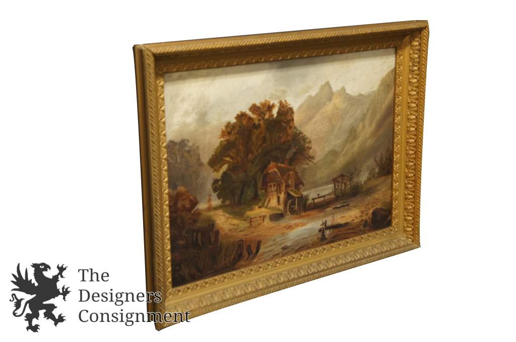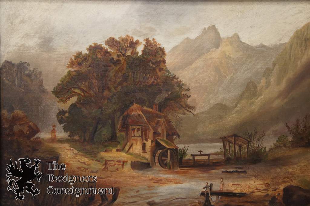 Original Oil attributed to George Simmons a frontier painter circa mid 1800s. A gorgeous country landscape of figures near the water mill.