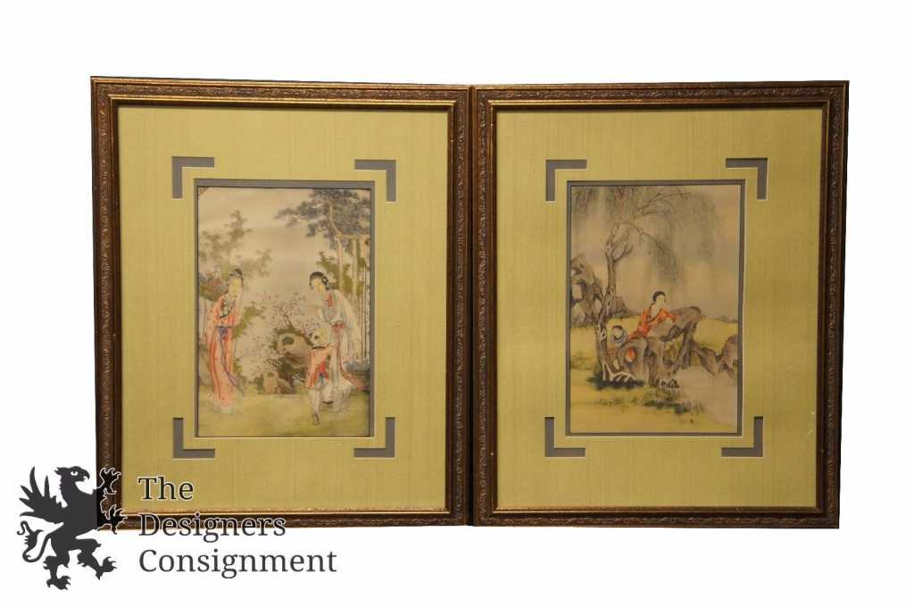 A lovely pair of paintings on silk. One features a child in the garden with 2 women, and the other depicts a fishing scene. Each is uniquely matted and framed.