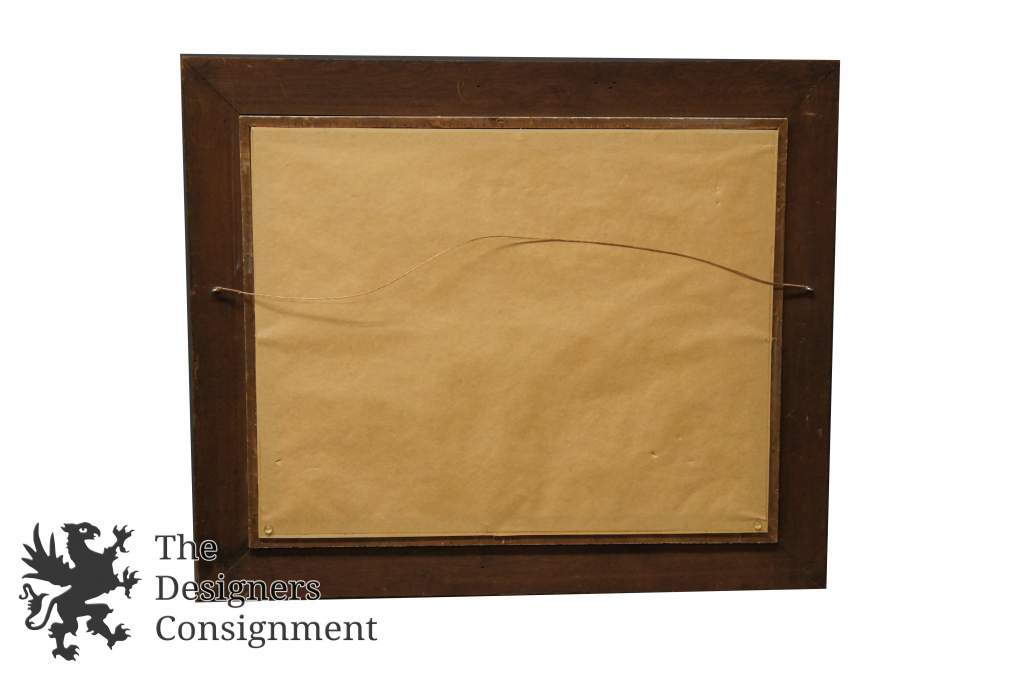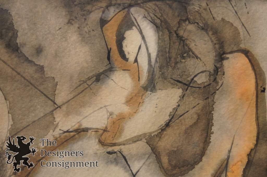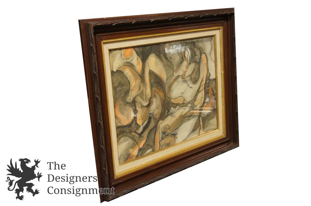 Signed Watercolor Painting on Paper Abstract Modern Gray Brown Carved Wood Frame