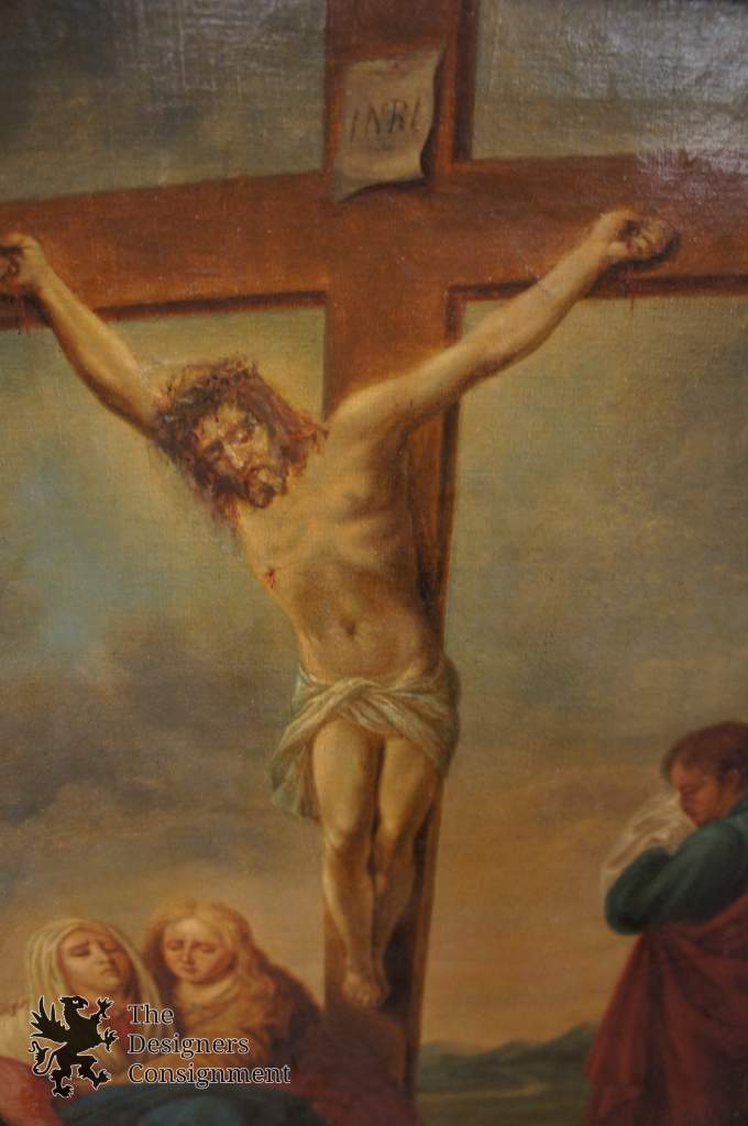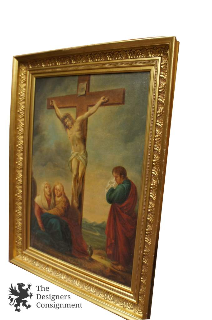 A stunning 19th Oil painting depicting theCrucifixionof Jesus. Mary and thedisciples can be seen mourningbelow the cross. Painted on Canvas. Purchased from Denmark in 2001. Framed in Wood with carved trim and gold leaf. A great addition to any collection.