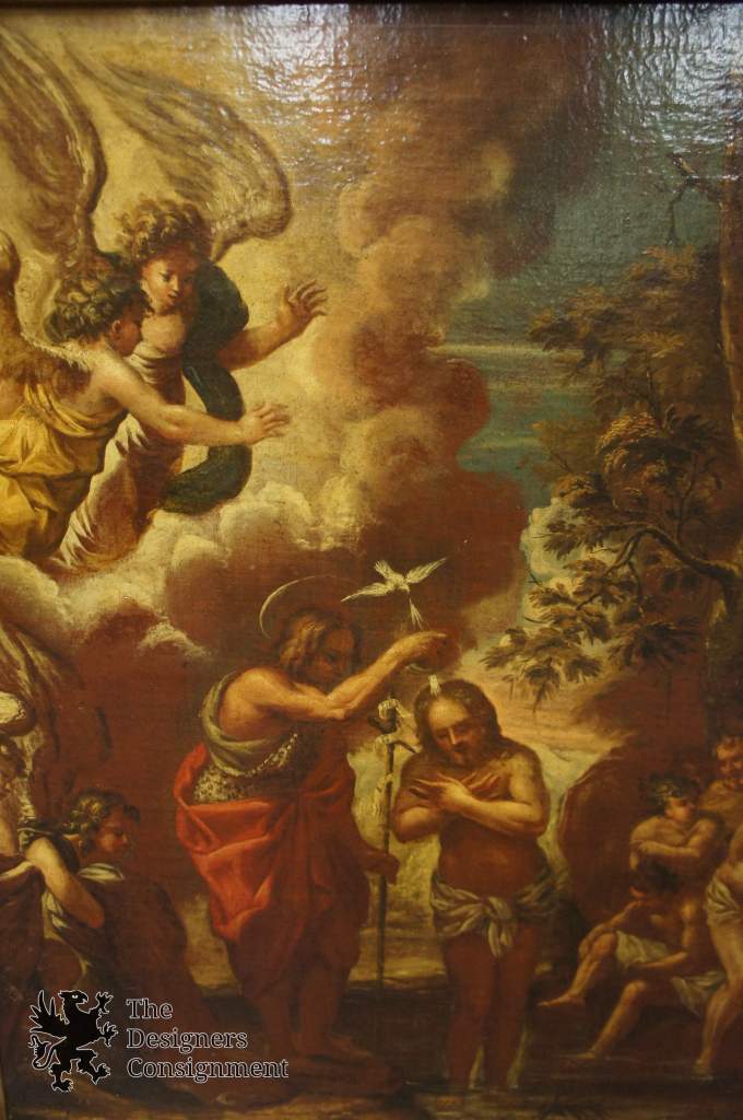 An amazing oil painting with intricate detail and color. Depicts the baptism of Christ. Ornately framed in gold tone. Frame is wood with elaborate gesso accents. An Early 17th century work.