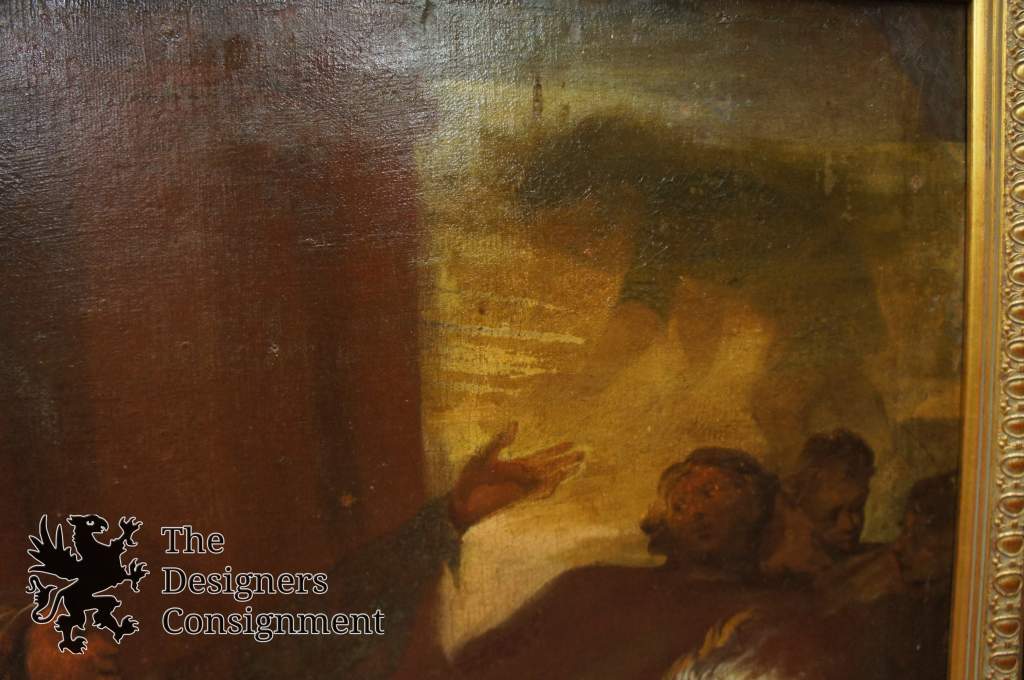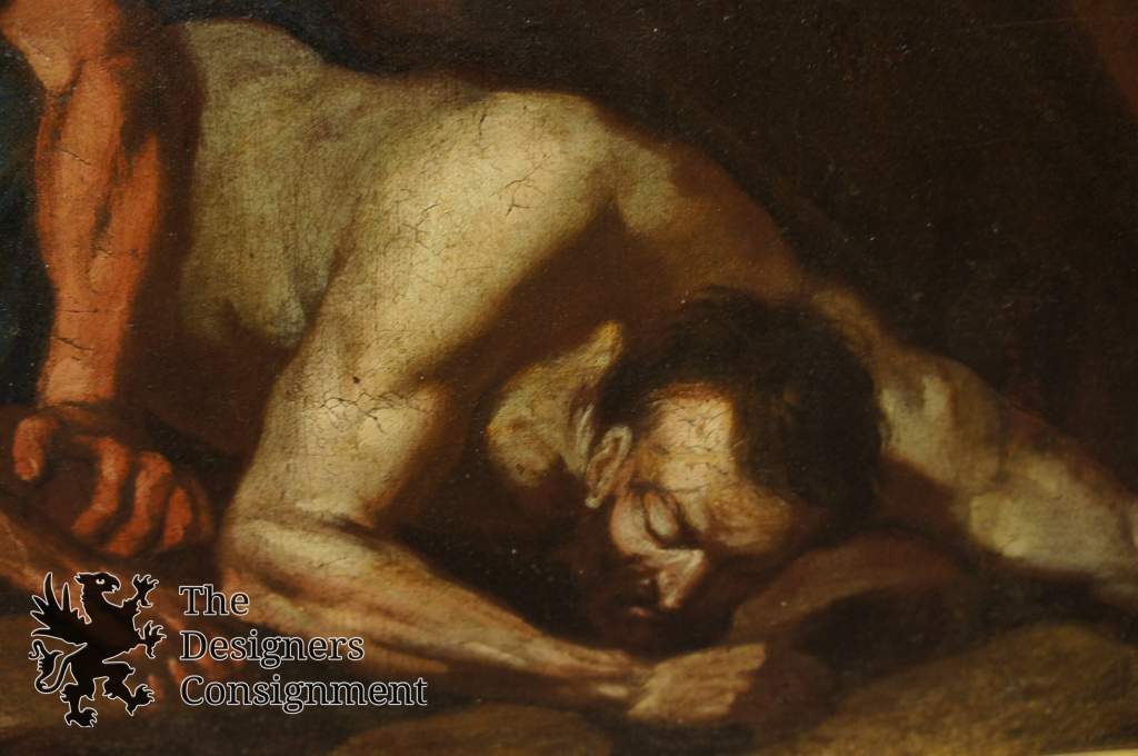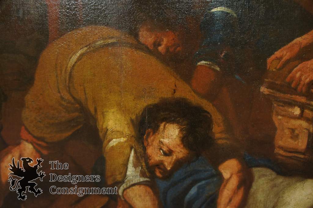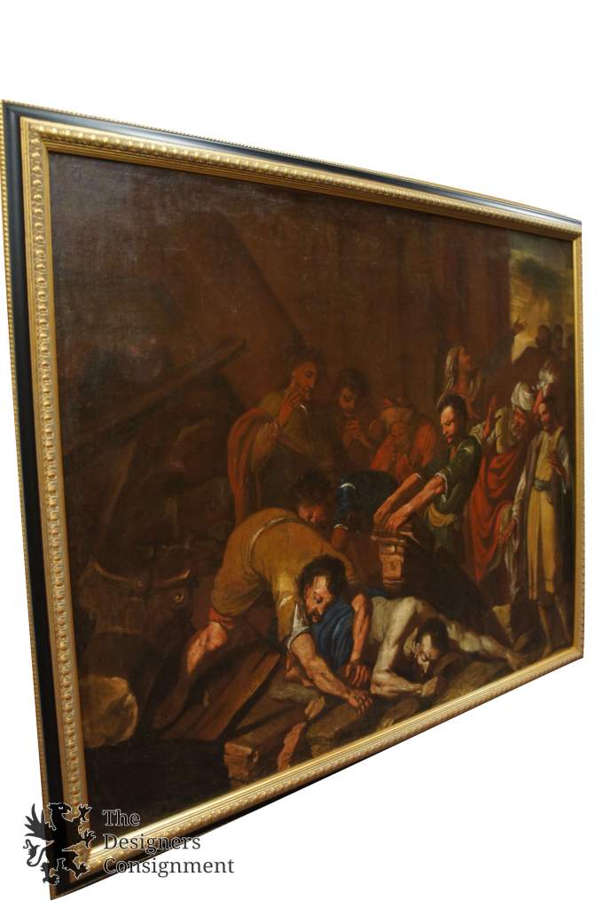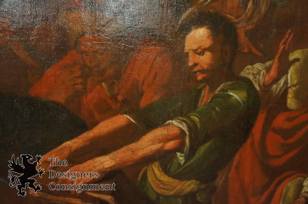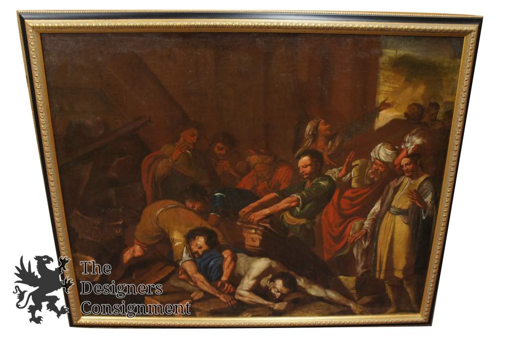Painting depicts Samsonpurposefullycollapsing the Temple foundation on his enemies. Trapped below, which is where he meets his end. His spirit can be seen along the right leaving his body. Painting is of Italian Origin, circa 18th Century. Unsigned.