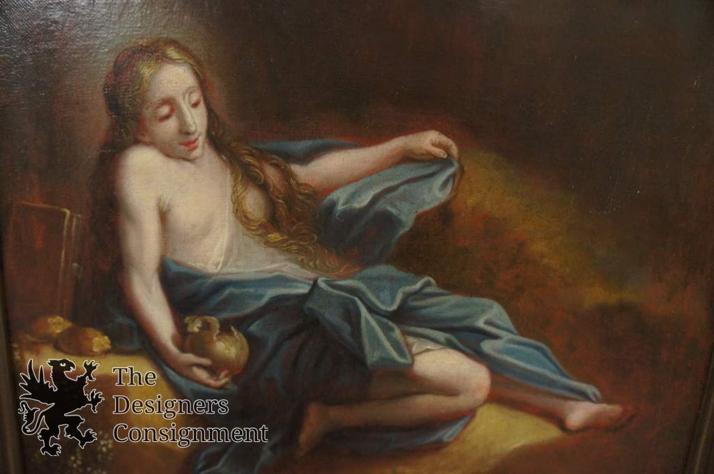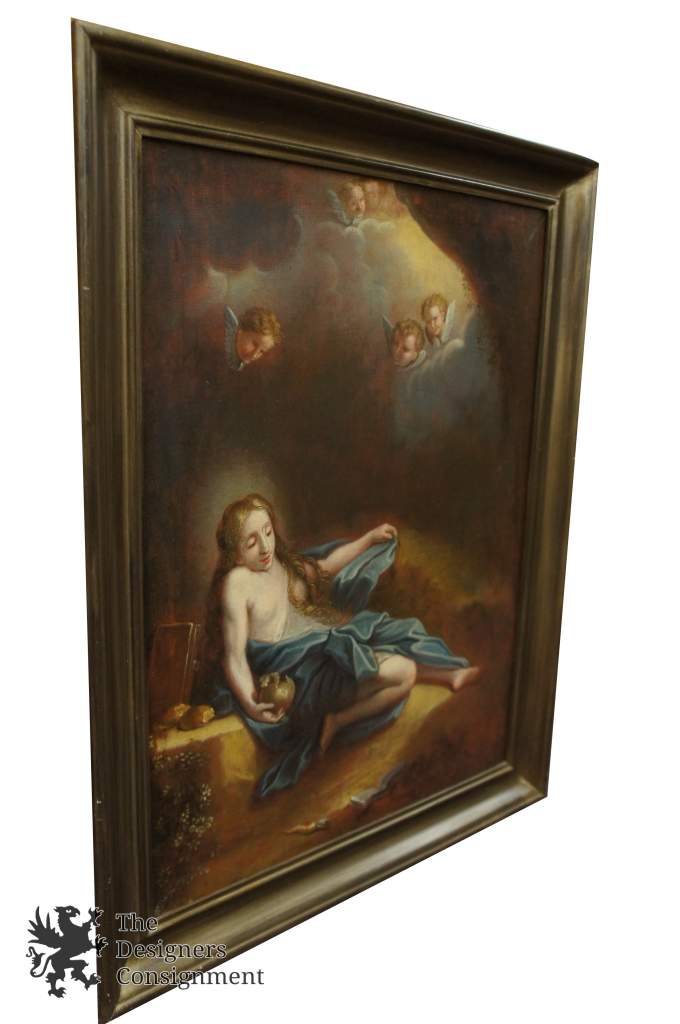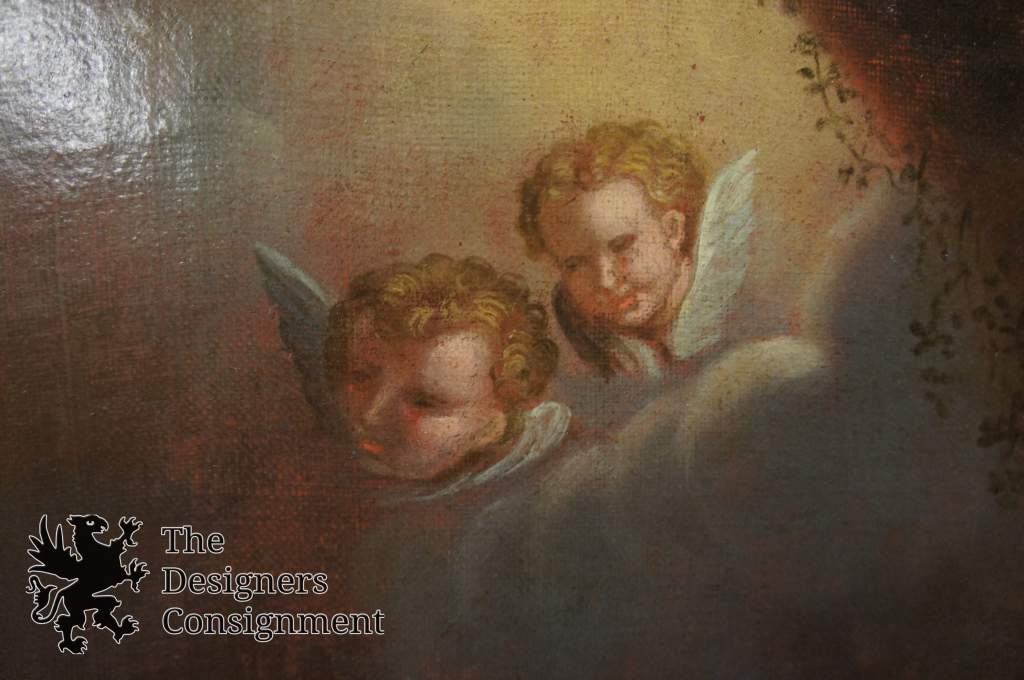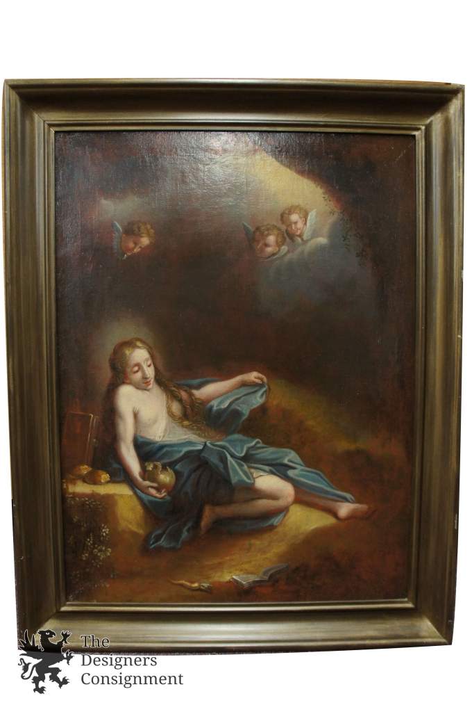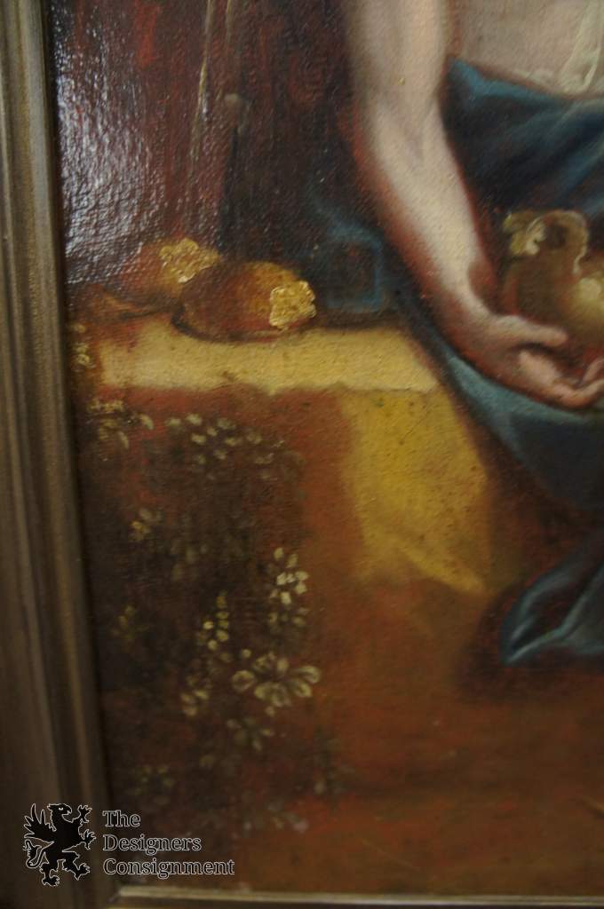 18th century oil painting on canvas. Featured is a Nymph lounging while eating. 4 Angels can be seen above amongst the cloudy sky of purple hues. Below the Nymph there are flowers, and a book appears to be behind her. A newer 20th century framed finished in dark gold. There is writing on the top frame of the canvas, but I cannot make out the name.