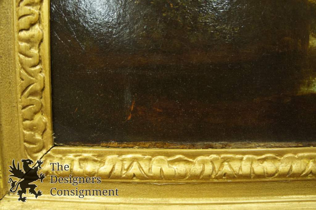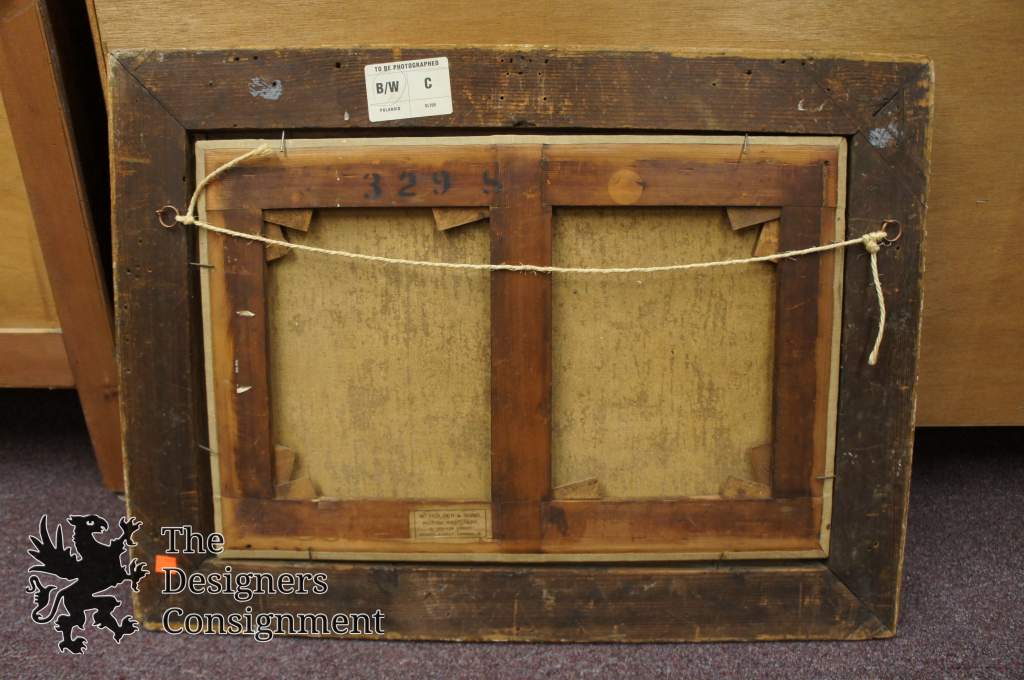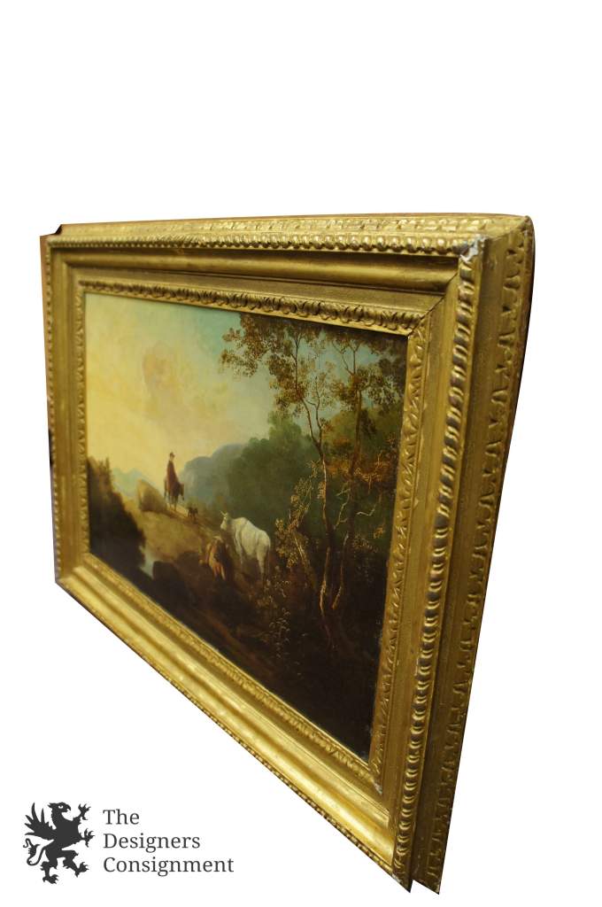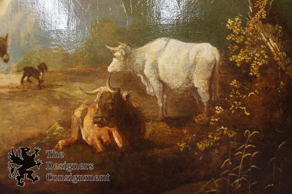 A gorgeous 18th century painting depicting a man on his donkey as he comes atop the hill heading home. Cows are lounging near a stream to the right in addition to the dog leading the donkey. Amazing with lifelike detail into setting. The tree off to the right is meticulously detailed down to each leaf. On the bottom right there are remnants of an old signature. Along the back there are the numbers 329 S along the upper stretcher. Towards the bottom right of the frame you will see a sticker from W. Holder & Sons picture restorers out of Britain. These restorers got started in the 1600s, but this particular sticker refers to the legacy that operated from 1886-1950. Overall a magnificent piece that will be a great addition to any collection.