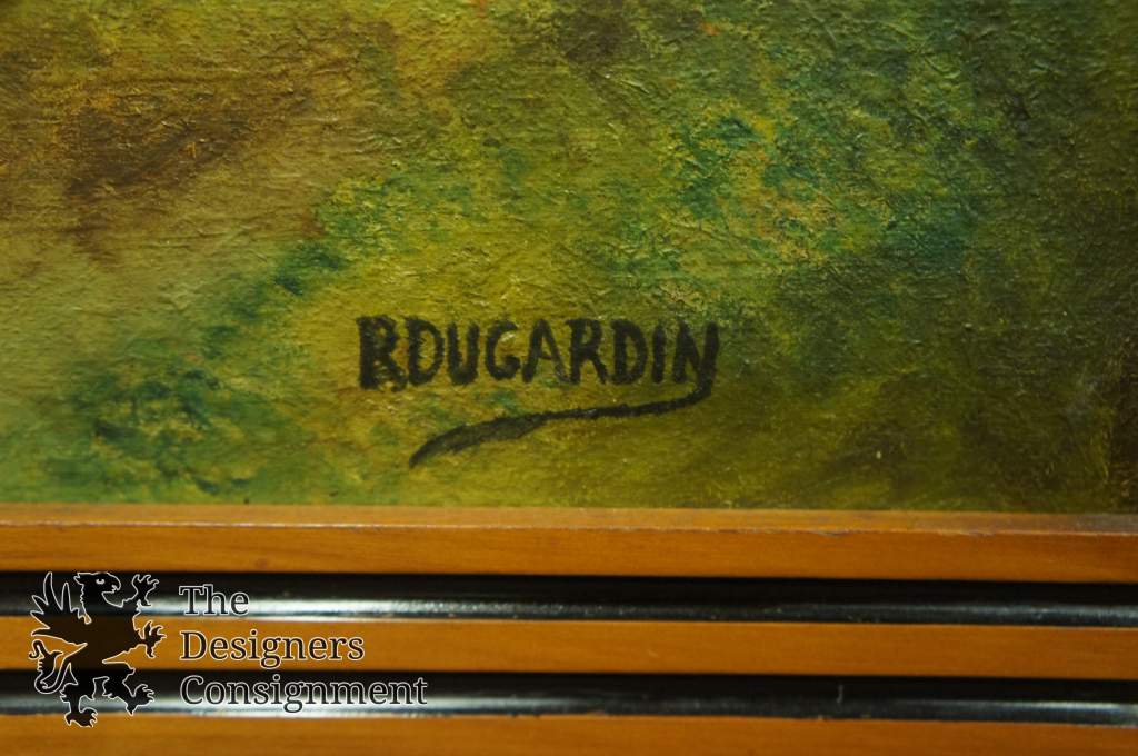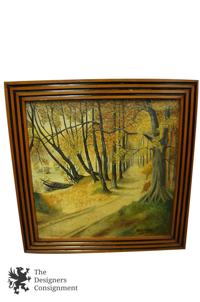 Gorgeous pair of 20th century oil painting by R. Dugardin. A meticulous fall woodland setting with great color. both show a pathway through the woods. One looking down the pathway of trees, while the other is perpendicular to the road showing a fence and trail in the distance. Framed in wood with a grooved black boarder making these pieces really stand out. Perfect fort any setting.