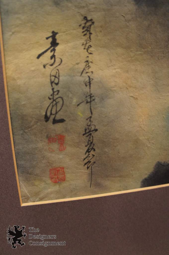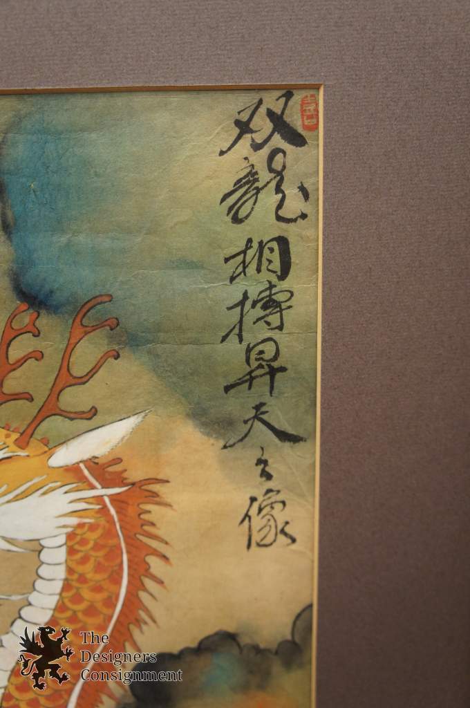 Chinese Watercolor Painting on Paper Orange Blue Dragons Fighting in Clouds Sky